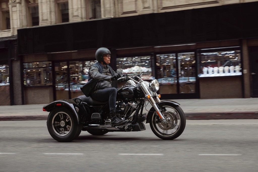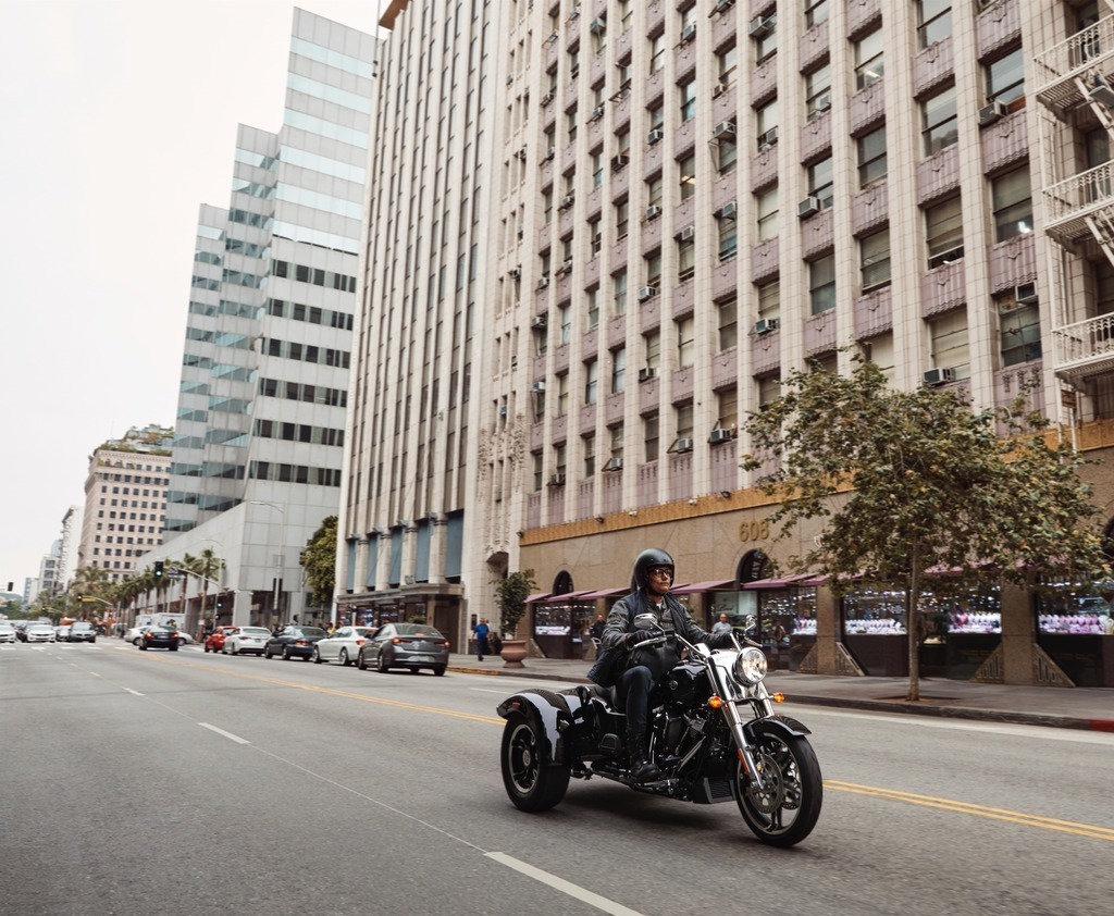 Der Freewheeler® bietet völlig neue Bremsverbesserungen wie kurvenoptimierte Reflex™-verbundene Bremsen mit ABS und Traktionskontrolle. Klassische Designelemente wie Bobtail-Kotflügel, Slash-Cut-Auspuffrohre, 12-Zoll Mini-Ape-Lenker und Enforcer-Aluminiumräder unterstreichen den Look. Es gibt ausreichend Stauraum für zwei Integralhelme plus zusätzliches Gepäck. Für reichlich Leistung sorgt der Milwaukee-Eight® 114 V-Twin Motor. 49 mm Vorderradgabeln mit Dual-Bending-Valve-Technologie und eine leicht einstellbare Hinterradfederung sorgen für eine sanfte Fahrt.