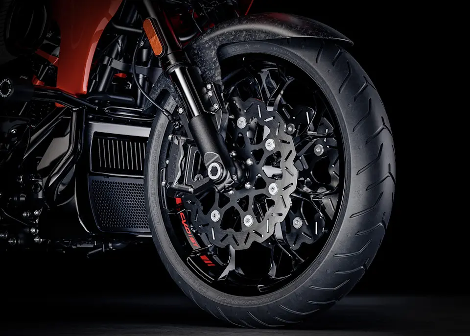 Zwei schwimmend gelagerte Hochleistungs-Bremsscheiben bieten optimale und fadingfreie Bremsleistung auch bei extremer Belastung. Im Zusammenwirken mit dem niedrigen Gewicht der Räder perfektionieren sie die Beschleunigung, die Handlichkeit und die Beherrschbarkeit der CVO ST.