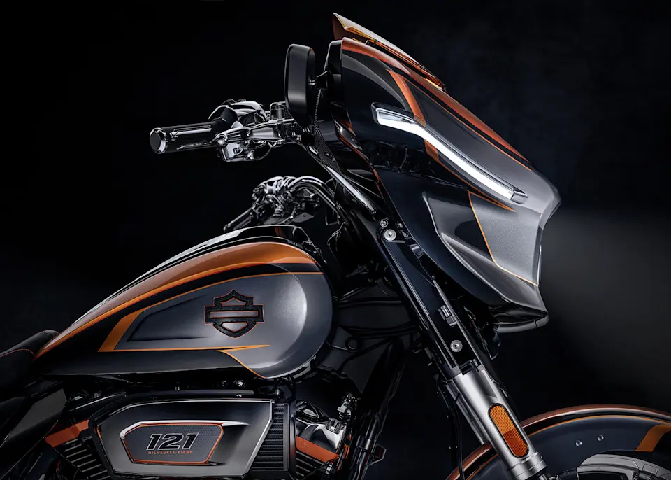 Nur für die CVO Street Glide erhältlich, erregt die neue Lackierung in Torched Orange Tri-Tone Aufmerksamkeit aus jedem Blickwinkel. Sie ist kombiniert mit Akzenten in hellem Chrom und in farbloser Eloxierung an Antriebsstrang, Auspuffanlage, Bedienungselementen und Tankkonsole. Gabel, Verkleidungsunterteile und Bremssättel hingegen glänzen unter dem bernsteinfarbenen Windschild, das das Design im unverkennbaren CVO Stil abrundet.