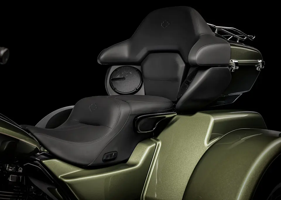 Das neue Grand Tour-Pak und die neue Gepäckraum-Baugruppe bieten jede Menge Stauraum im unvergleichlichen Harley-Davidson Stil. Eine integrierte LED-Beleuchtung, Premium-Auskleidung, Lautsprecher-Einsätze für den Sozius und ein neuer Gepäckträger verbinden Praktikabilität und Stil. Das Gepäck bleibt organisiert, und das Profil ist insgesamt im perfekten Einklang mit der Verkleidung.