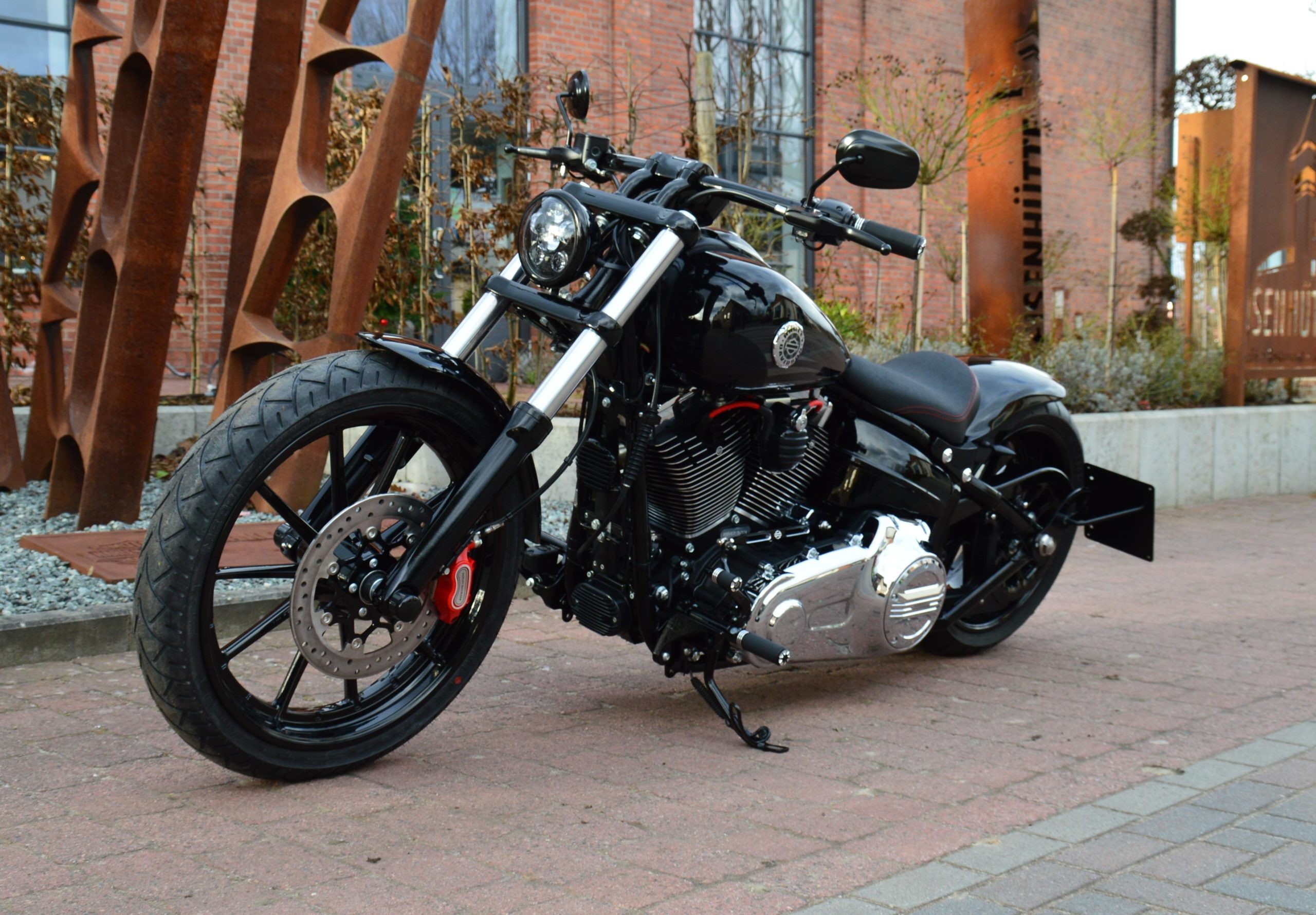 Harley-Davidson Softail Breakout 2016 Umbau für die neue Saison. Der Fokus liegt hier auf “Schwarz”. Viele Bauteile wurden nachträglich pulverbeschichtet oder durch schwarze ersetzt. Das Herz der Breakout, der hubraumstarke 103 CUI Motor, veredelt mit Deckeln aus der Airflow Kollektion, sticht dabei im Chrom-Design heraus. Der kurze Thunderbike Harley-Davidson Heckfender in Verbindung mit dem 260er Metzeler Hinterreifen lassen die Breakout noch mächtiger wirken. Weiter wird der Reifen dank des seitlichen Kennzeichenhalter nicht verdeckt. Für die Sicherheit wurde ein Harley-Davidson LED Daymaker Scheinwerfer verbaut und leistungsstarke Kellermann LED Blinker hinten erhöhen die Sichtbarkeit. Der richtige Klang wird durch die elektronisch verstellbare The Jekill & Hyde Company GmbH Schalldämpfer-Anlage in Verbindung mit einer kurzen Krümmeranlage erzeugt. Zu guter letzt wurde die Optik durch Details mit roten Zündkabeln, roten Bremssätteln Vorne / Hinten, roten Sitznähten und der Burst Griff- und Rasten-Kollektion abgerundet.