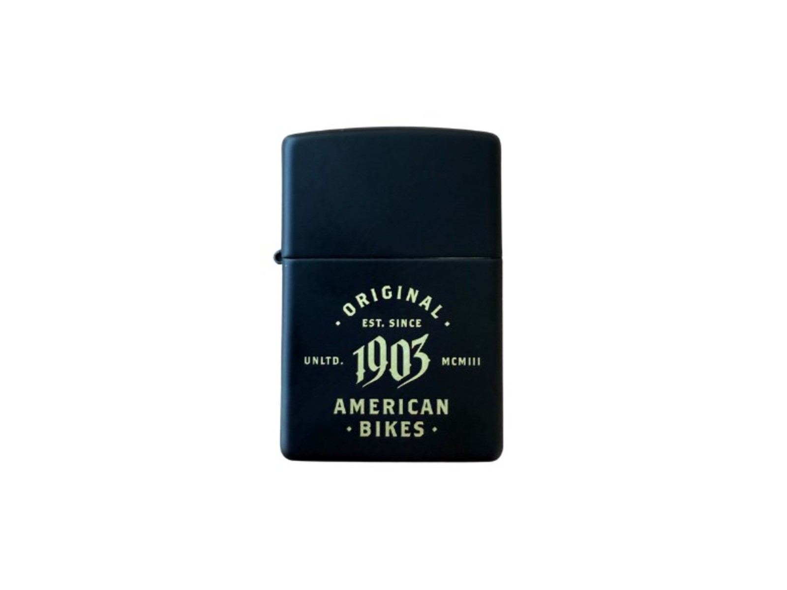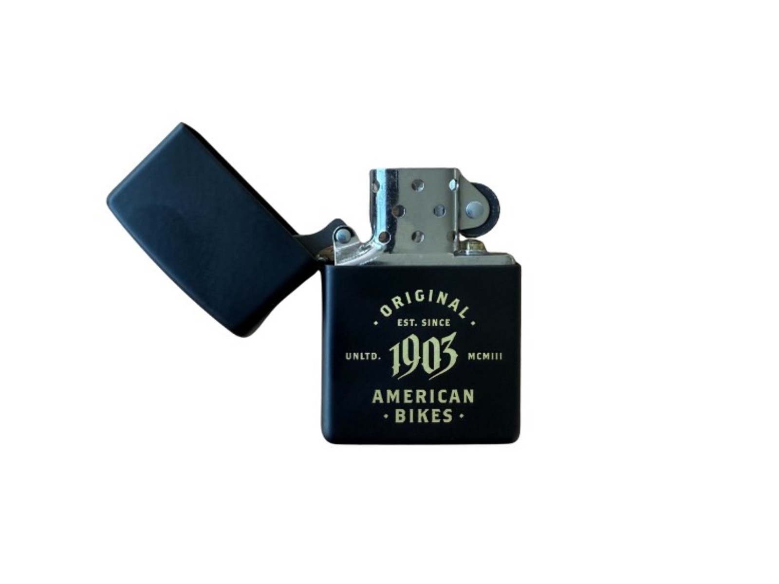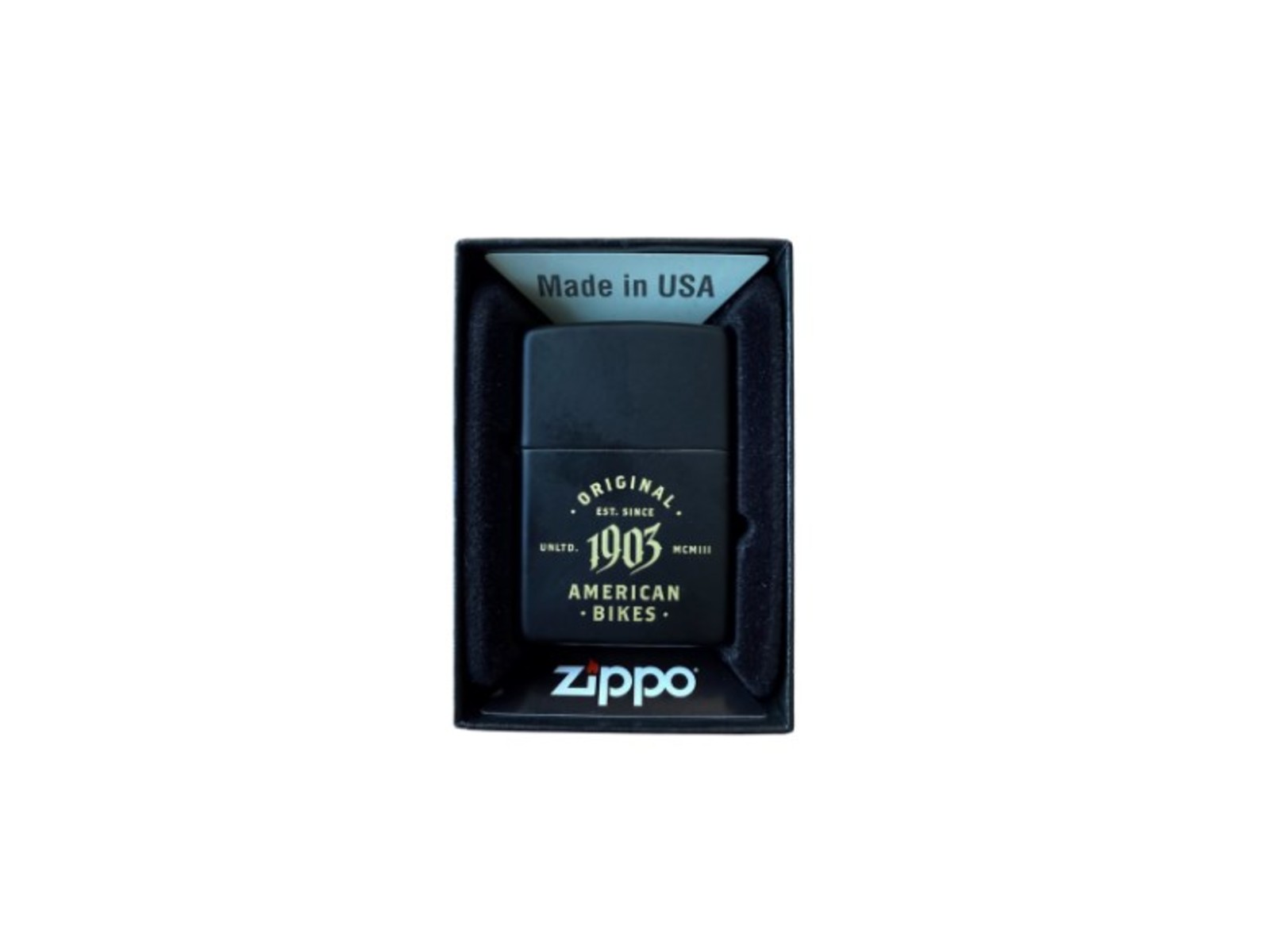 - Design: Schwarzes Zippo mit goldenem „1903 American Bikes“-Print