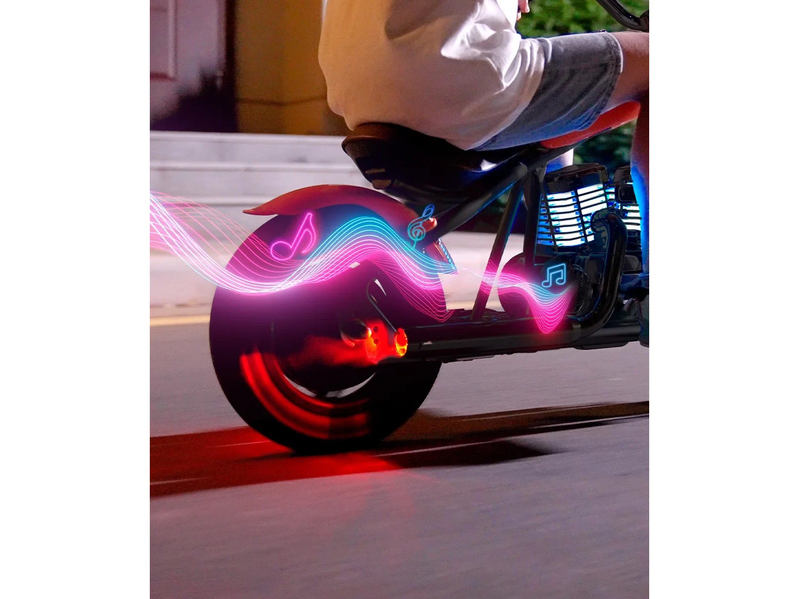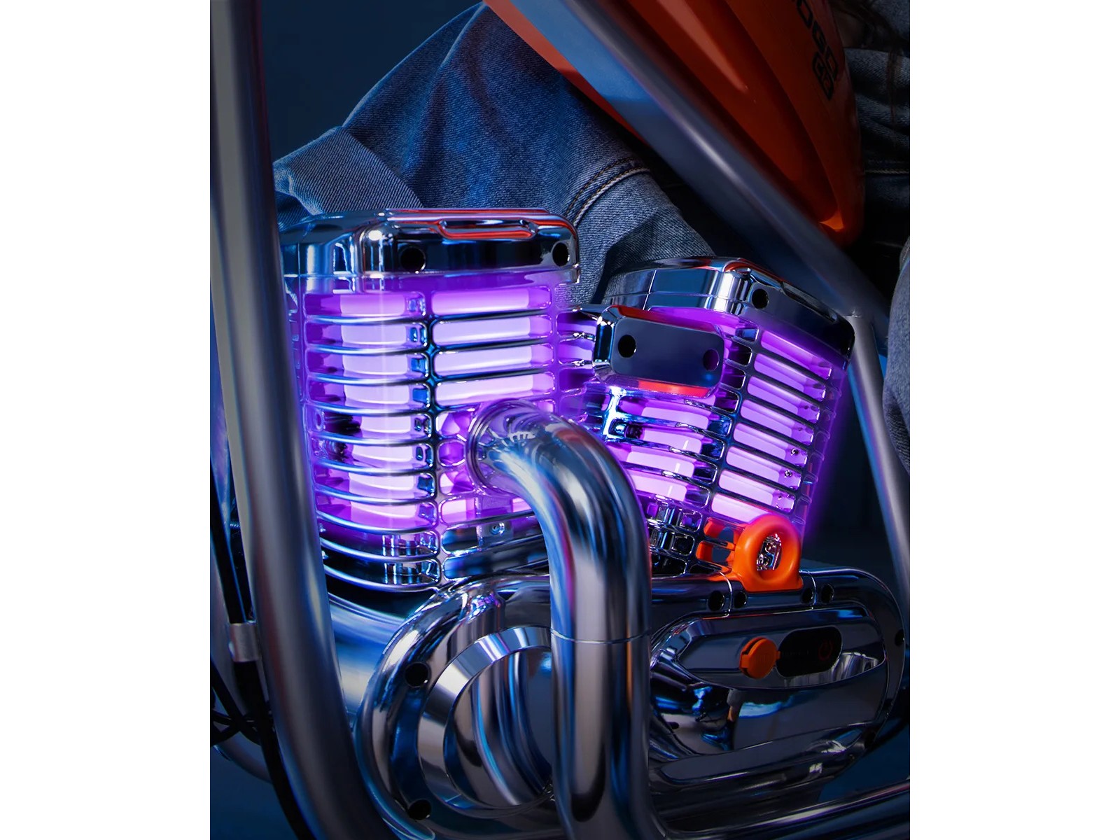 - Engine-Sound-System: Das Bike simuliert auf Knopfdruck das satte Knattern eines echten Verbrennungsmotors und sorgt so für ein immersives Fahrerlebnis.