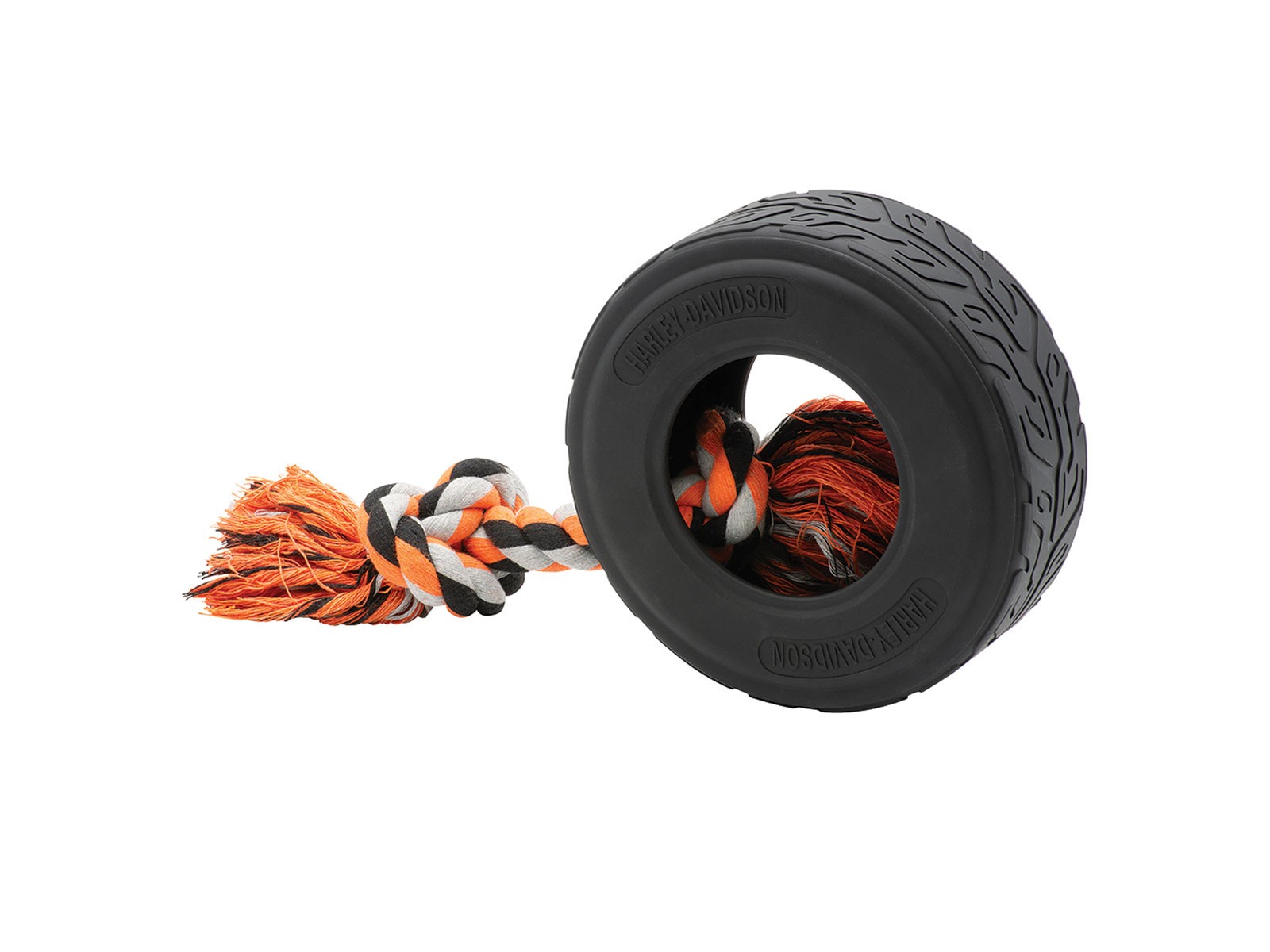 Speziell angefertigtes Gummireifenspielzeug für Haustiere mit H-D-Reifenprofil und geprägten Harley-Davidson-Logos. Der dreifarbige, geknotete Baumwollseilgriff sorgt für zusätzlichen interaktiven Spaß. Beaufsichtigen Sie Ihr Haustier während der Benutzung immer.