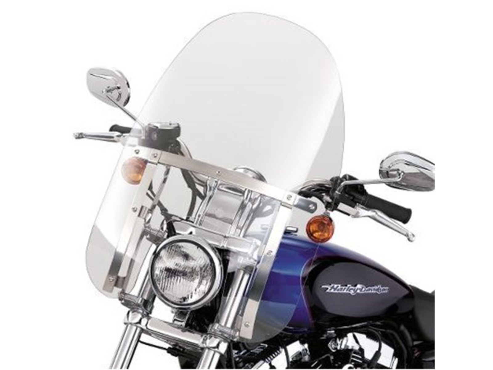 Kombinieren Sie die klassische Harley-Davidson® Windschutzscheibe mit einem neuen, revolutionären Befestigungssystem und erzielen Sie ein Optimum an Styling und Funktionalität. Formschöne, gegossene Halterungen mit Schnellverschlüssen fixieren die Windschutzscheibe an den Gabelholmen, nach dem Abnehmen bleiben keine verunstaltenden Halterungsteile übrig. Sie haben so nicht nur den Vorteil einer raschen Montage und Demontage ohne Werkzeug, sondern genießen auch einen klaren Custom-Look. Kein Werkzeug erforderlich, und Kit inklusive aller zur Montage der Windschutzscheibe benötigten Teile. Die Windschutzscheibe aus gehärtetem Polycarbonat ist hart im Nehmen und trägt klassische, polierte Quer- und Längsstreben.