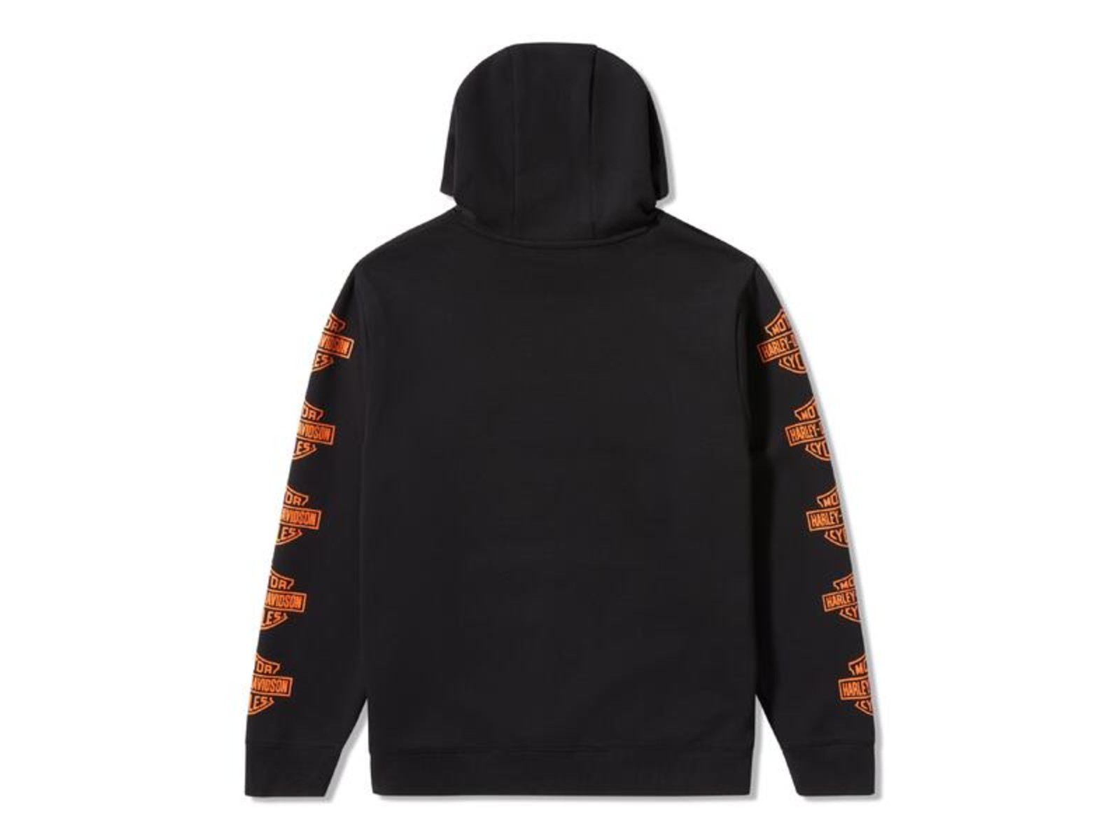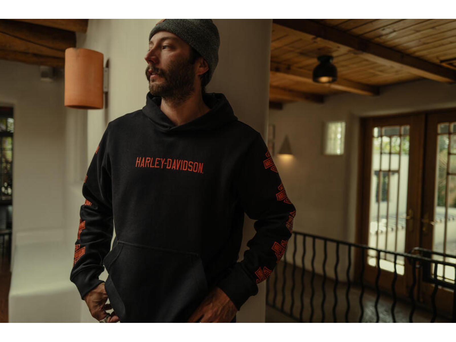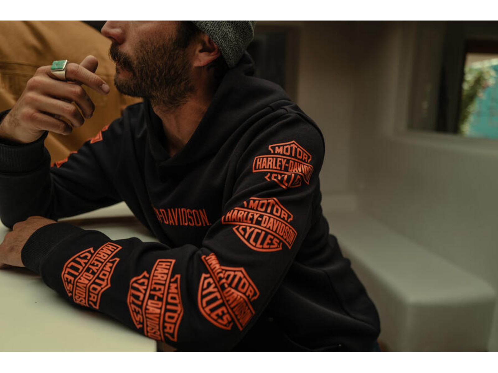 Ein klassischer Kapuzenpullover mit markanten Details – perfekt für entspannte Tage mit echtem Harley-Spirit.