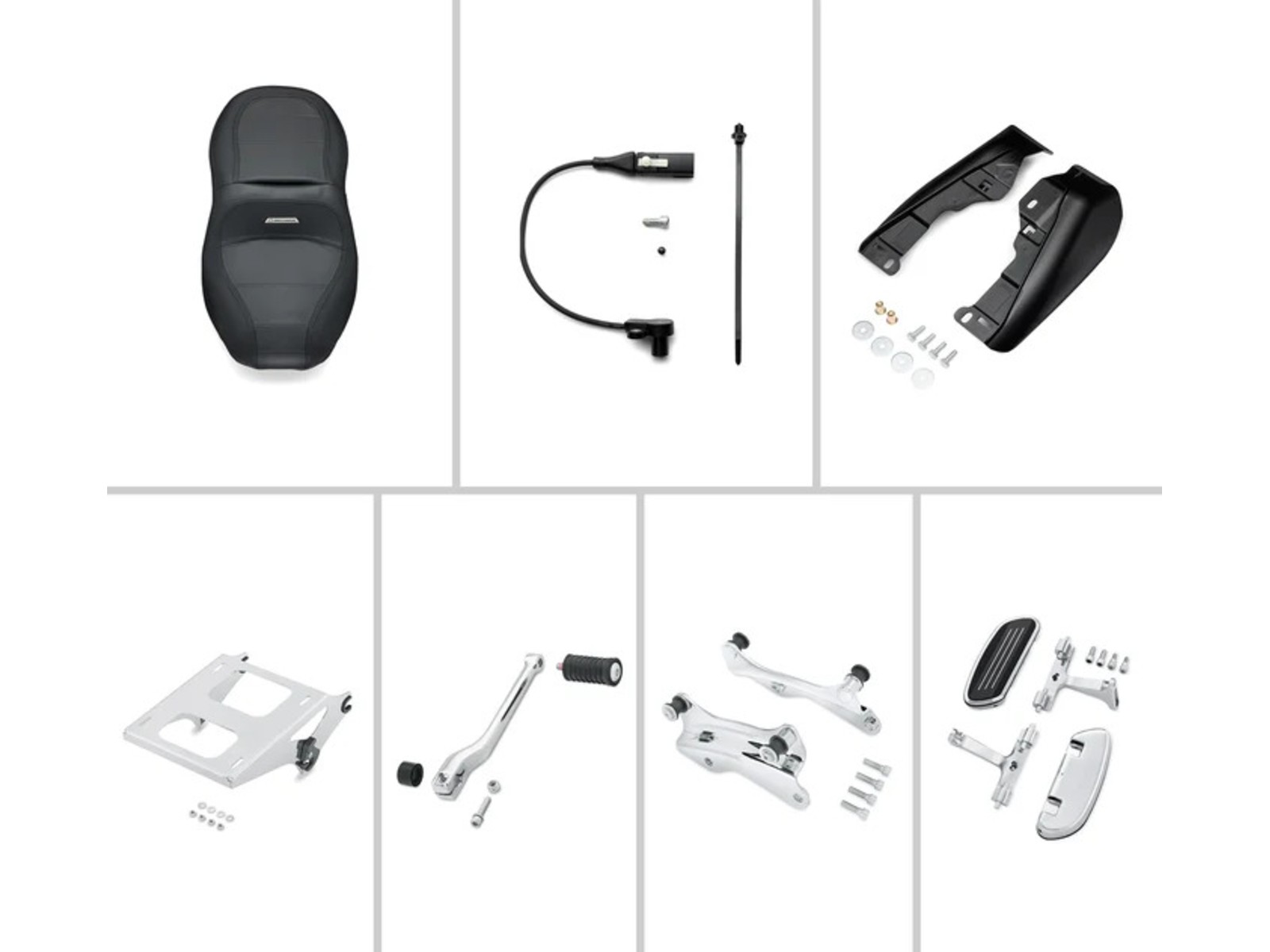 • Beinhaltet: H-D® Detachables™ Tour-Pak Gepäckträger für Doppelsitzbank, 4-Punkt-Montage-Kit, Sundowner™ Sitz, Mittelrahmen-Windabweiser, Fersenschalthebel, Streamliner Soziustrittbrett und Montagekit sowie Vehicle Hold Control Seitenständersensor