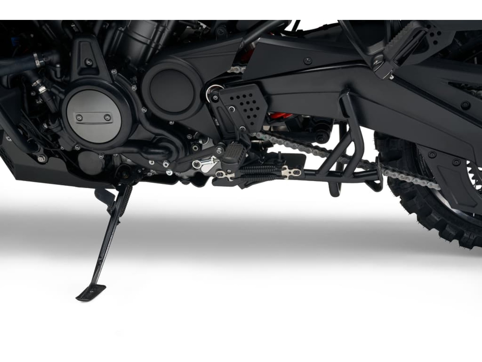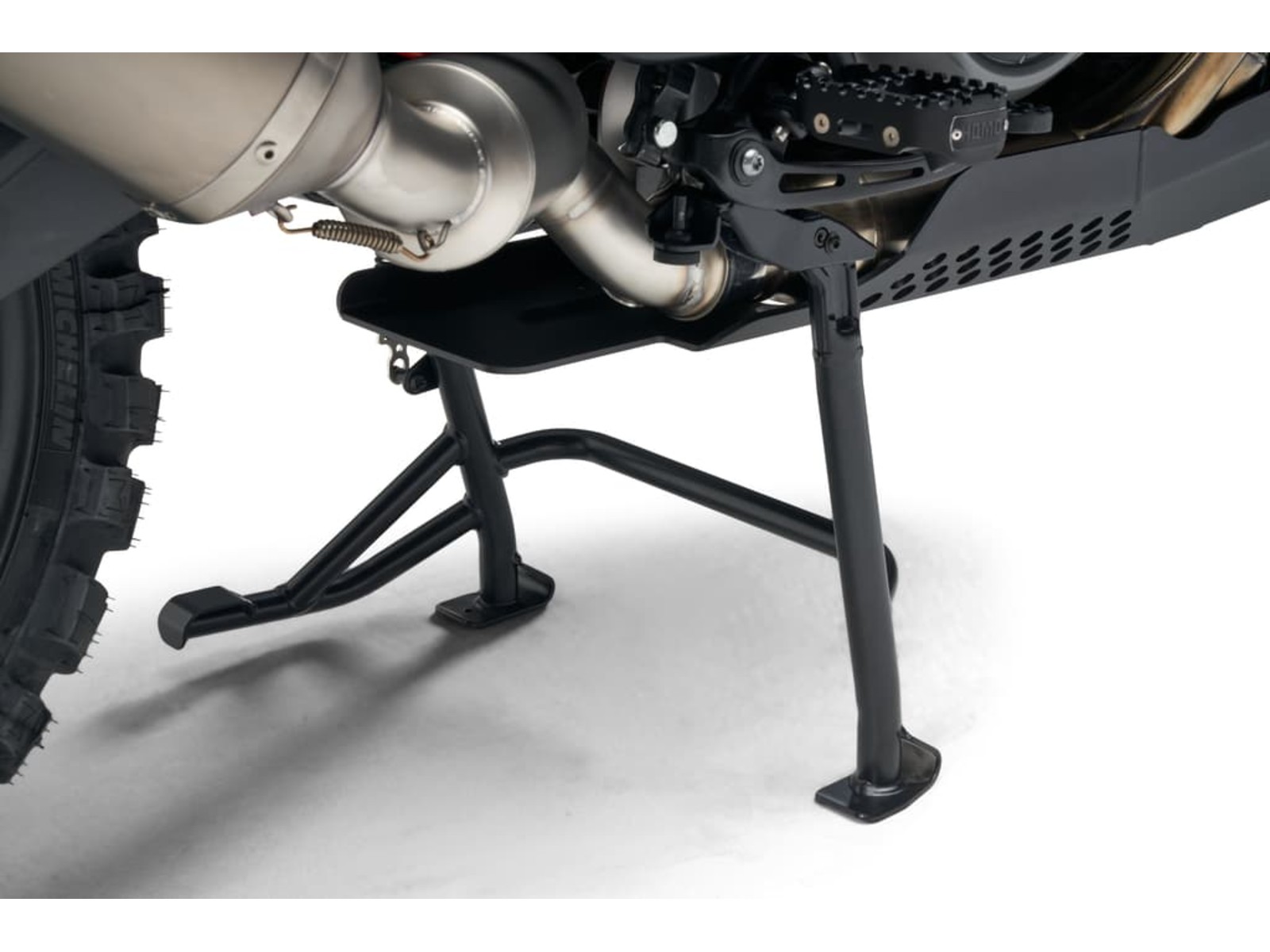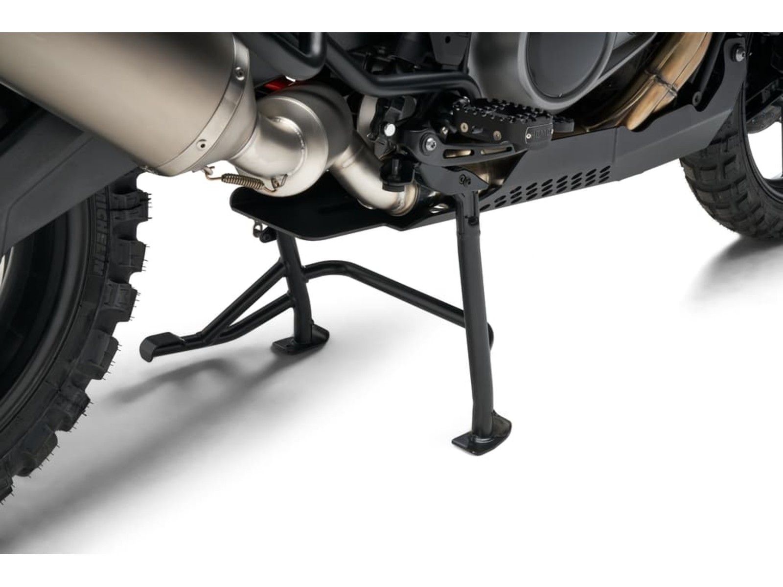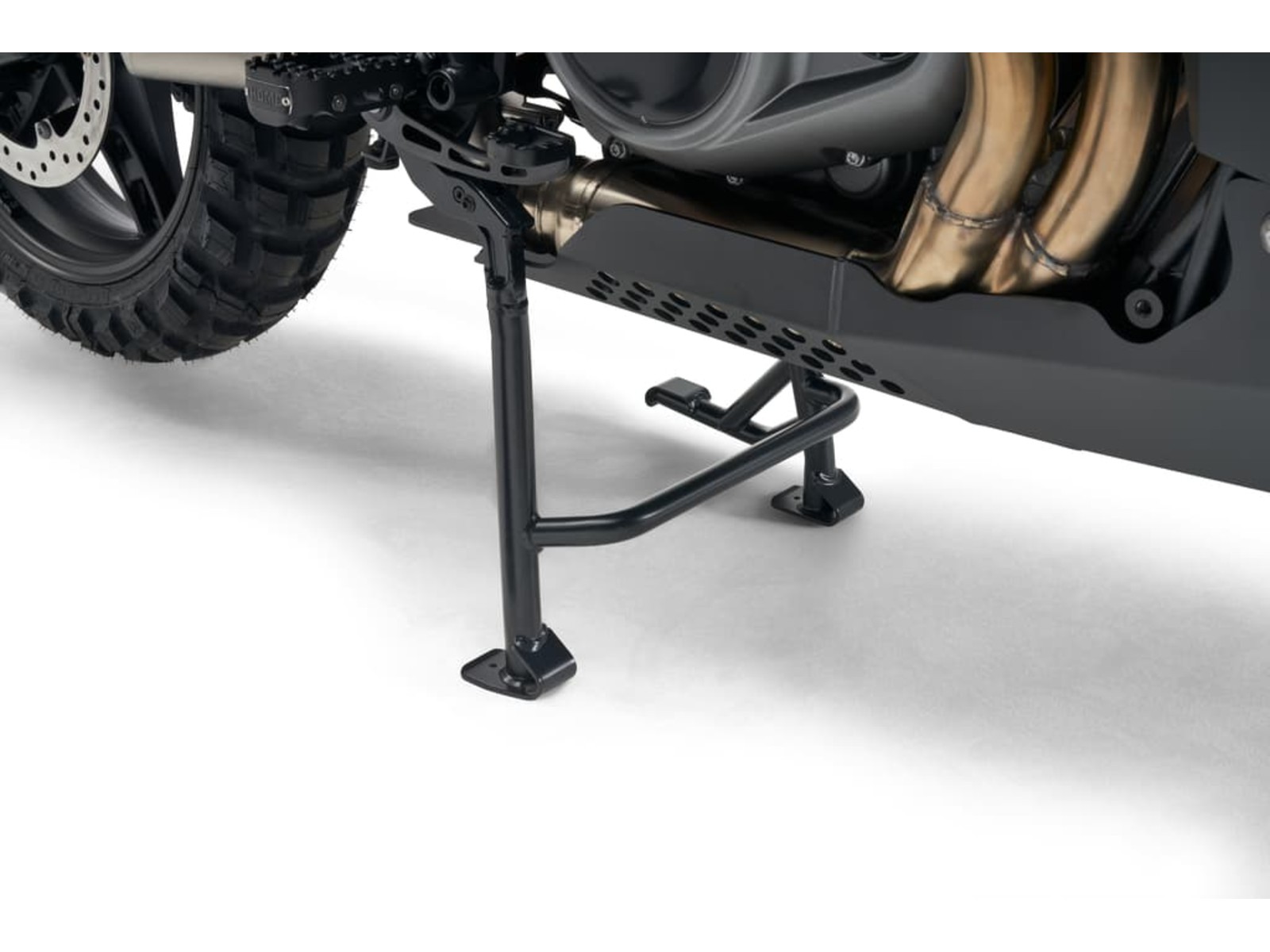 Der Mittelständer stützt das geparkte Motorrad in einer aufrechten Position.