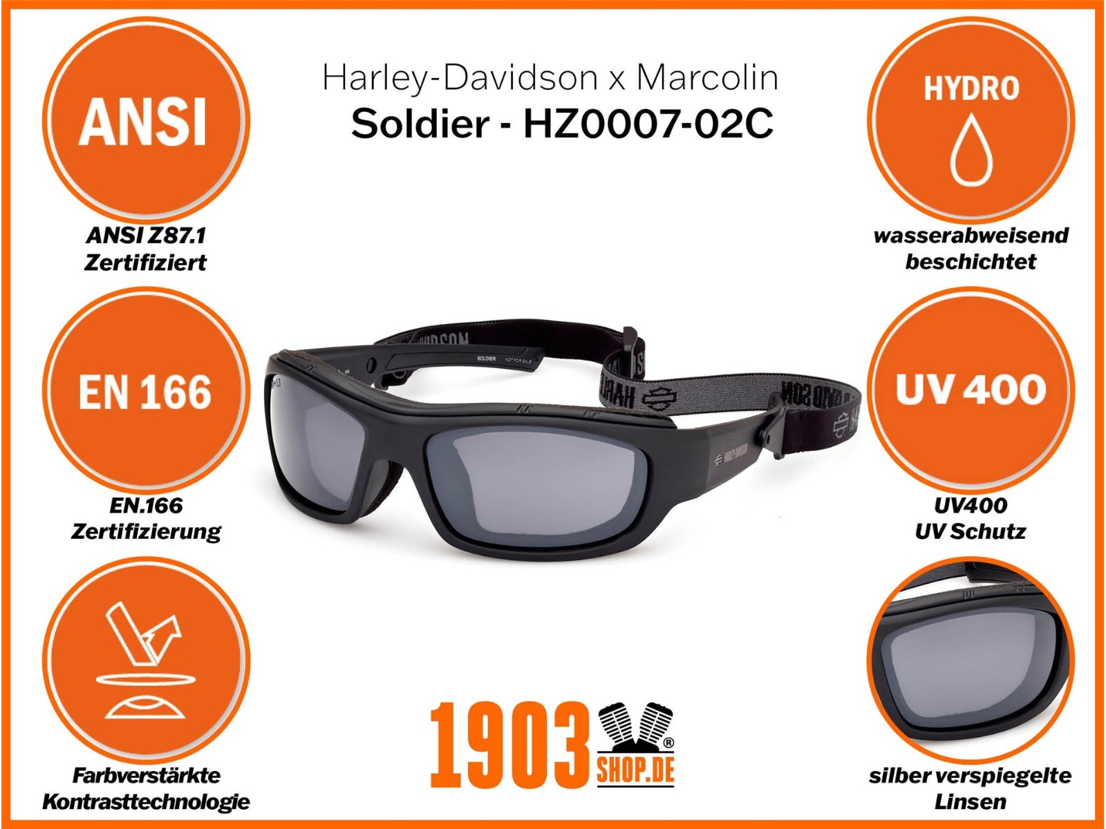Die Performance Sonnenbrillen von Harley-Davidson sind perfekt auf die Bedürfnisse von uns Bikern abgestimmt. Sinnvolle Funktionen unterstützen Deine Sicht und geben Dir auch bei schlechten Witterungsbedingungen mehr Durchblick. Harley-Davidson arbeitet bei seiner Performance Eyeware Kollektion eng mit dem bekannten Brillenhersteller Marcolin zusammen.