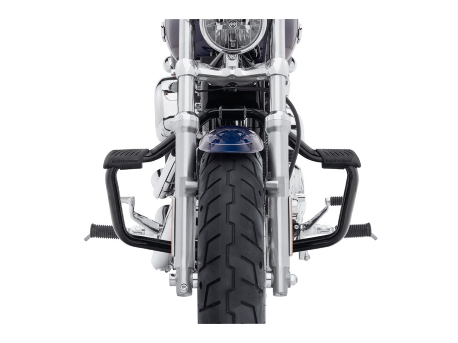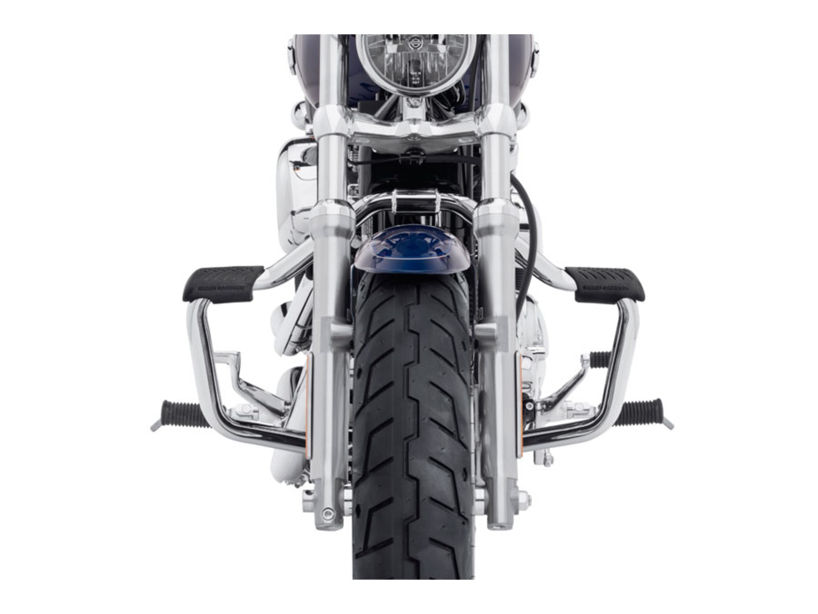 Kombinieren Sie klassische Form und moderne Funktionalität zu einem Motorschutz mit Finesse. Die fließende Form dieses Motorschutzbügels ergänzt den traditionellen Look des Bikes. In das elegant geschwungene Oberteil wurden Highway Fußrasten integriert. Bei Fahrten auf offener Landstraße bieten die Gummibeläge eine rutschfeste und komfortable Fußauflage. Das Kit mit dem einteiligen Schutzbügel enthält alle benötigten Montageteile.