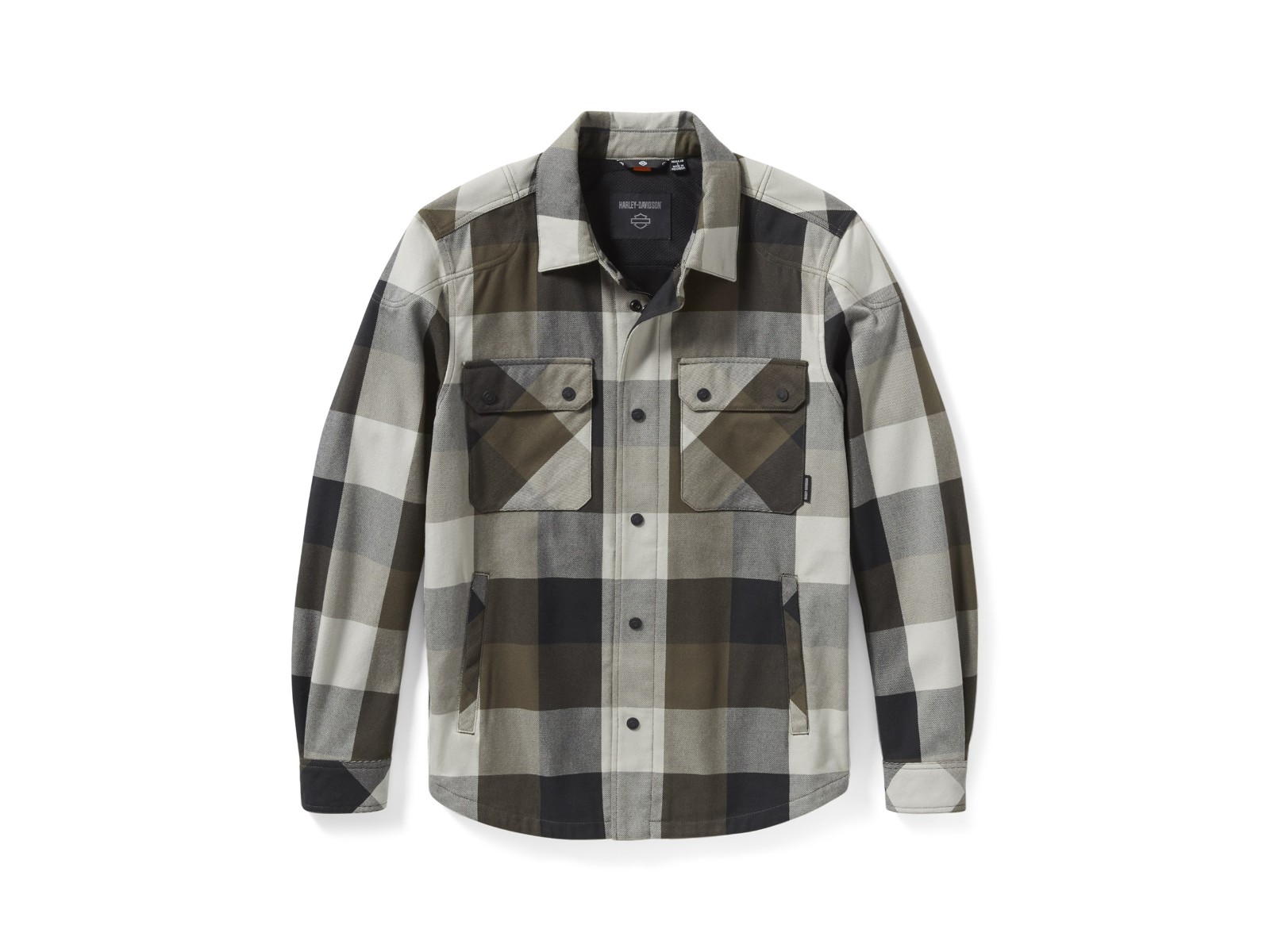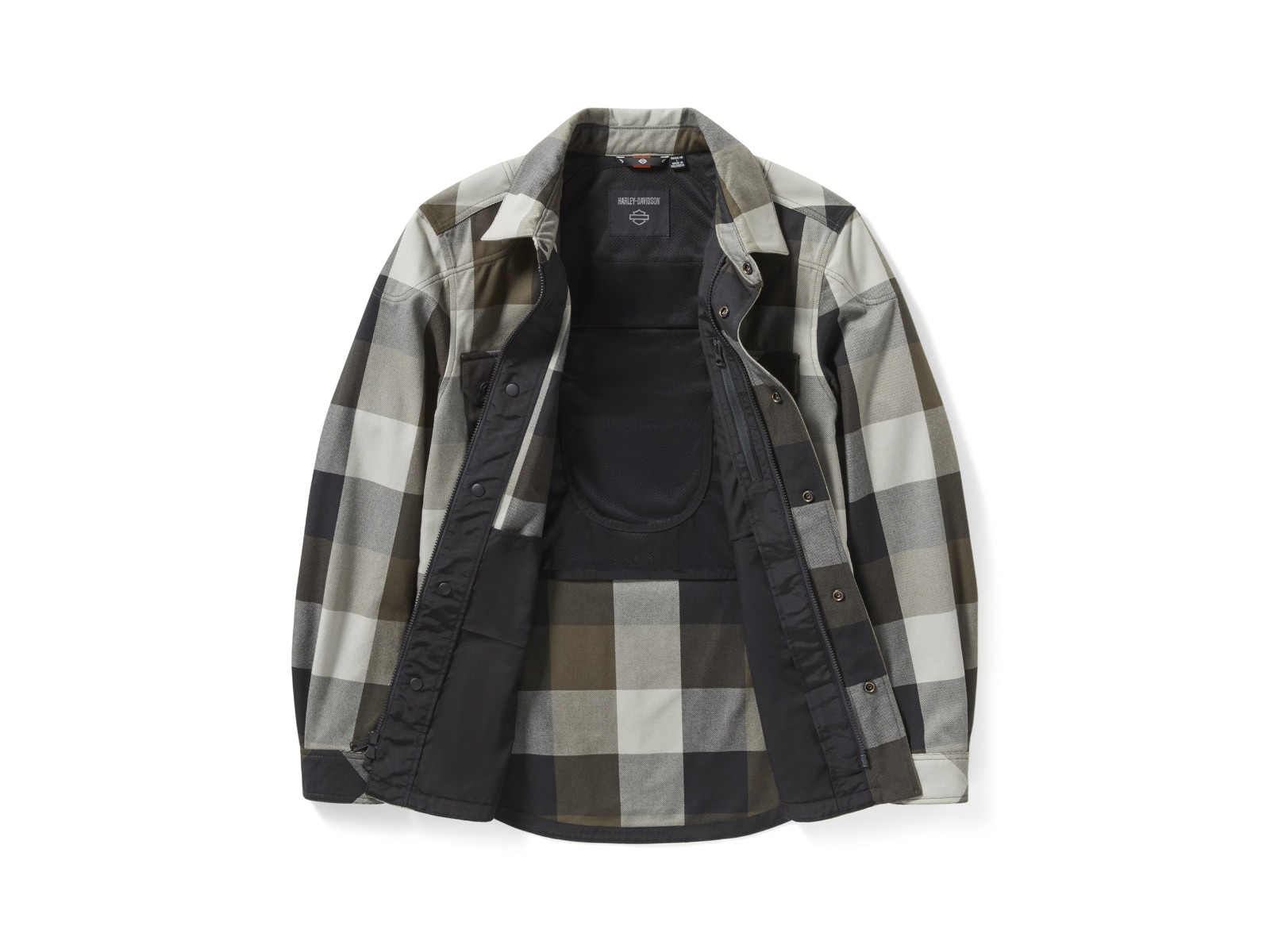 Eine Mischung aus Hemdjacke und funktioneller Ausrüstung. Unsere Operative Motorrad-Hemdjacke ist aus einer robusten Twill-Mischung aus Baumwolle und Polyester gefertigt und bietet Abriebfestigkeit in klassischem Schnitt. Für hervorragende Aufpralldämpfung bei gleichzeitiger Atmungsaktivität ist diese Motorrad-Hemdjacke an den Schultern und Ellbogen mit unseren D3O Ghost Protektoren ausgestattet. Sie überzeugt auch mit funktionalen Details wie Belüftungsöffnungen unter den Achseln, vorgeformten Ärmeln, reflektierender Kragenpaspelierung für erhöhte Sichtbarkeit und einem Kragen, der dank versteckter Druckknöpfe beim Fahren an seinem Platz bleibt. Sie bietet einen zeitlosen Look auch abseits Deines Bikes mit einer dezenten Version unseres gestickten Harley-Davidson Logoschriftzugs auf der Rückseite.