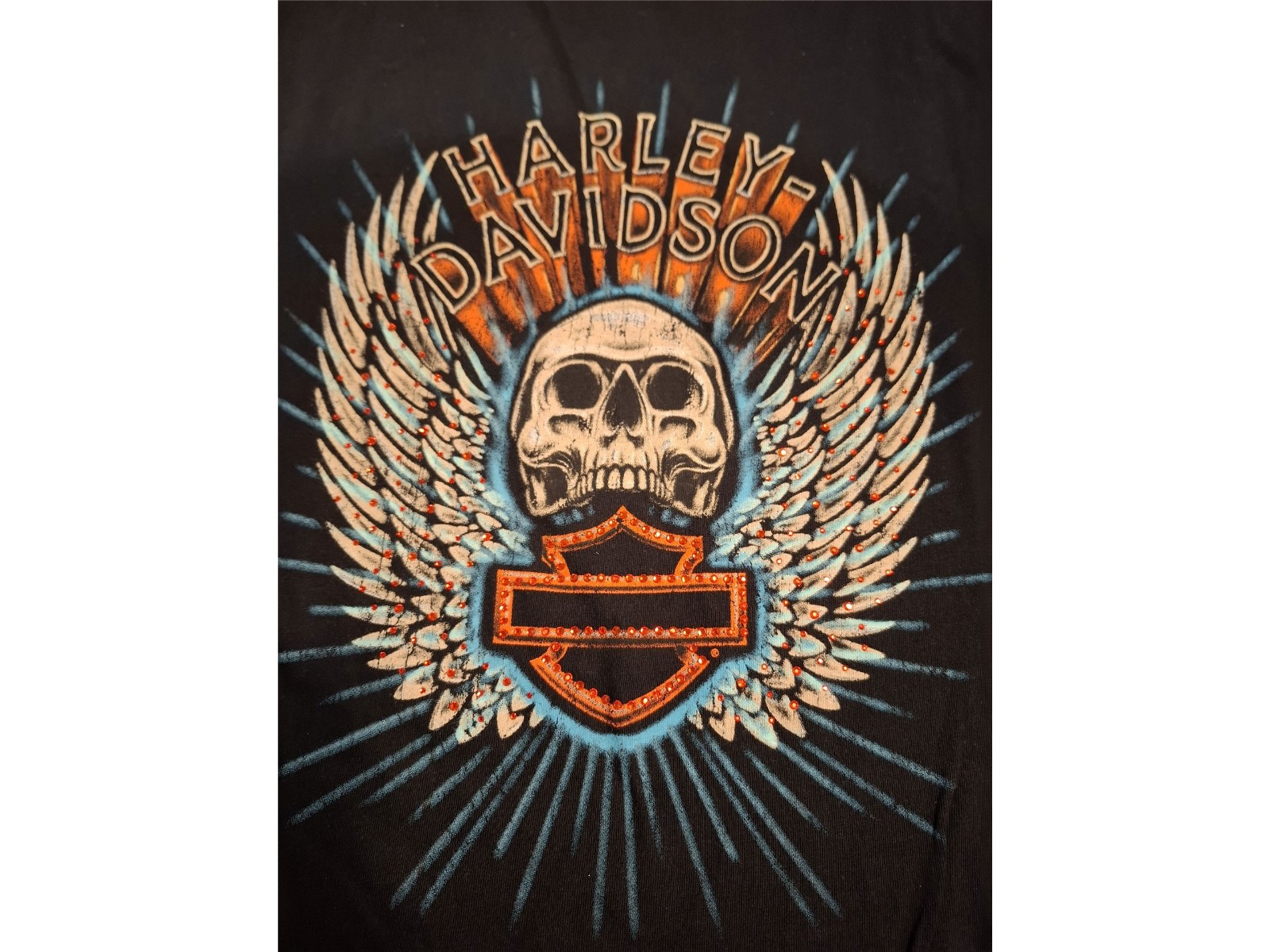 - Gedruckte Harley-Davidson Grafik – Besetzt mit roten Glitzersteinen für einen besonderen Akzent.