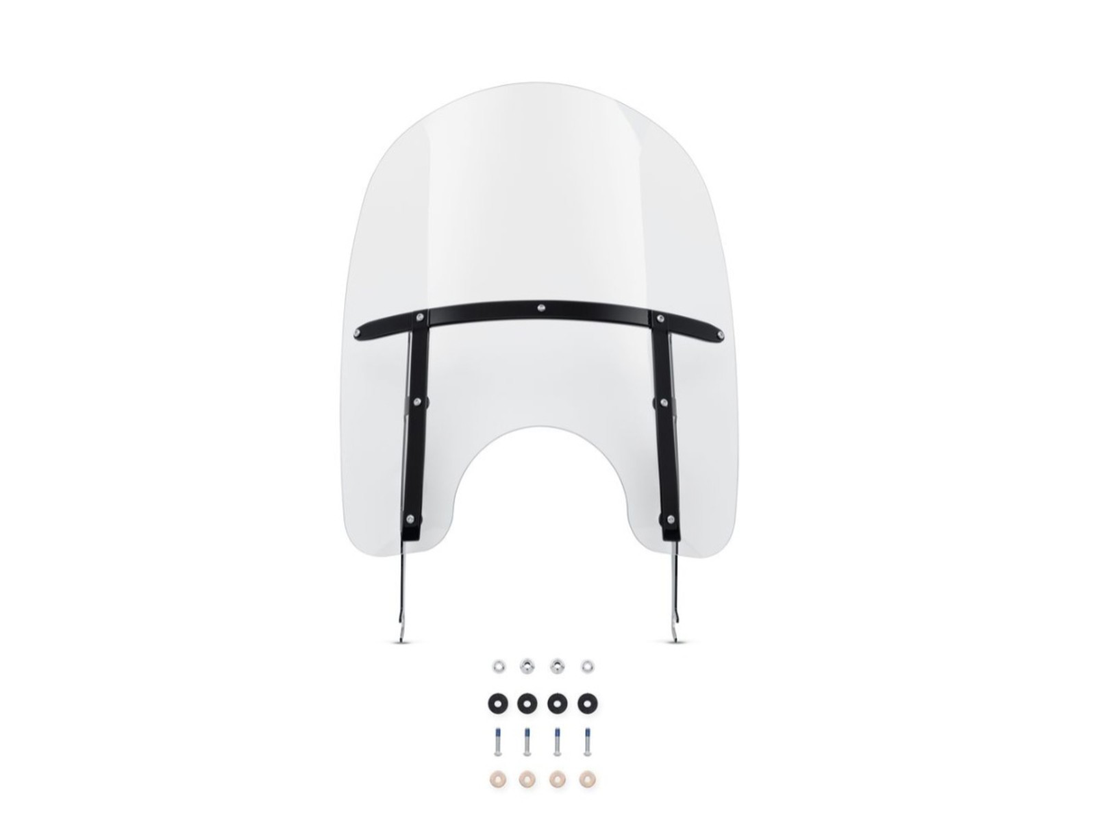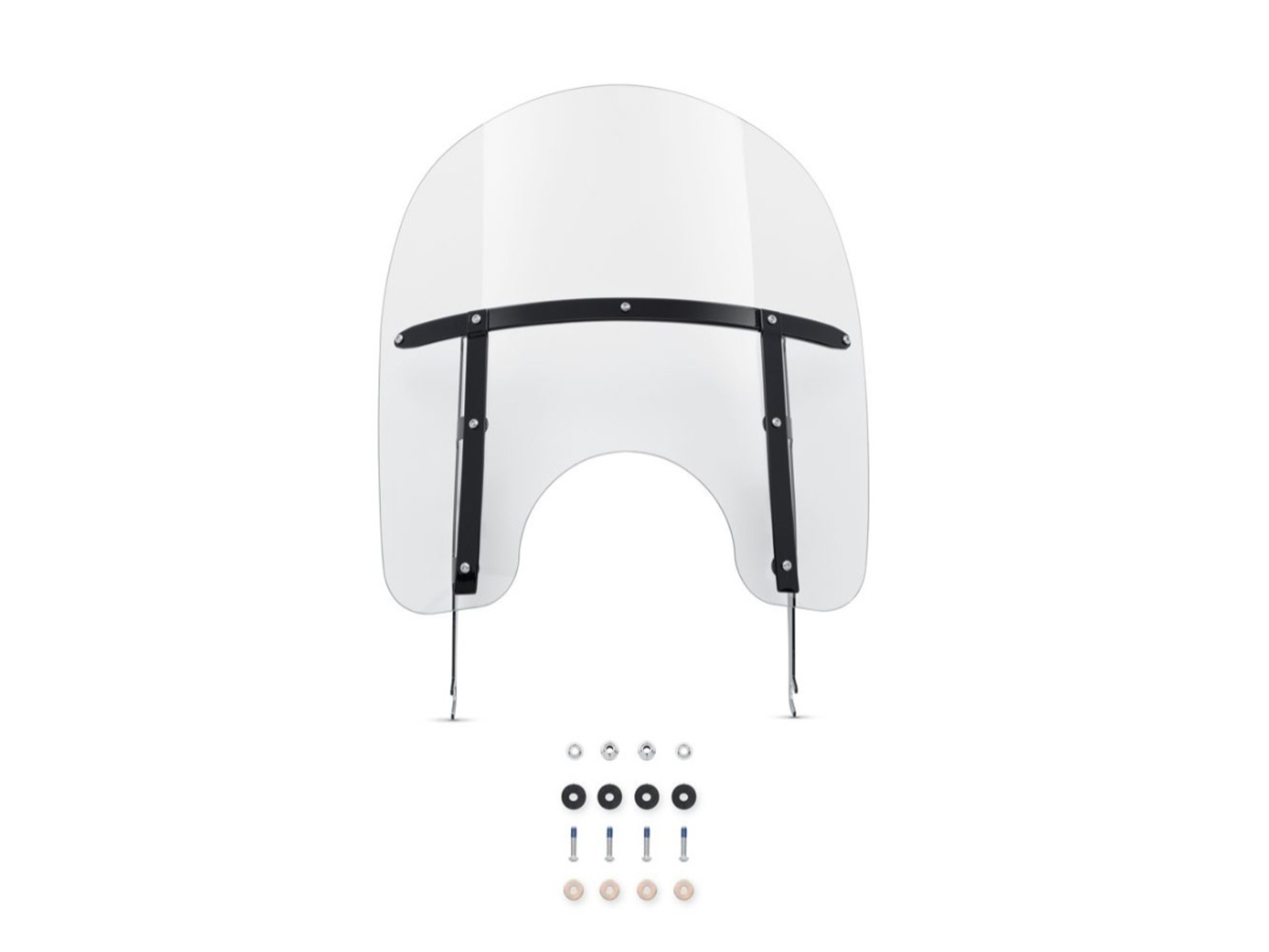 Da geht nichts dran vorbei. Die King-Size Windschutzscheibe stellt den ultimativen Schutz bereit. Diese vollständig abdeckende Windschutzscheibe sorgt für einen sauberen, abgeleiteten Luftstrom über und rund um den Fahrer und den Beifahrer. Da sie in Sekundenschnelle ohne Werkzeuge an und abgebaut werden kann, verleiht Ihnen eine abnehmbare Windschutzscheibe die Freiheit, Ihr Bike ganz schnell zu variieren. Über Land sind Sie vor den Elementen geschützt, und können die Windschutzscheibe schnell abbauen, um stilgerecht durch die Straßen zu fahren. Diese einteilige Windschutzscheibe ist aus gehärtetem Polycarbonat gefertigt und so gegen Kratzer und Schrammen geschützt. Die Scheibe wird mit Edelstahl-Montagehalterungen befestigt und zur besseren Isolierung mit Gummihülsen eingesetzt. Die Windschutzscheiben sind in einer Vielzahl von Höhen je nach Ihrer Körpergröße sowie mit traditionell polierten oder zeitgemäß schwarzglänzenden Streben passend zum Stil Ihres Bikes erhältlich. Kit inklusive Befestigungsteile.