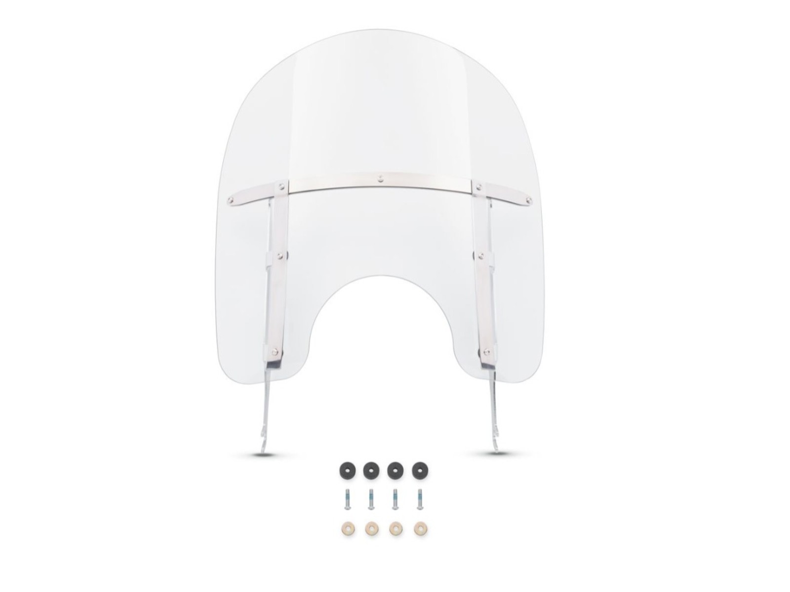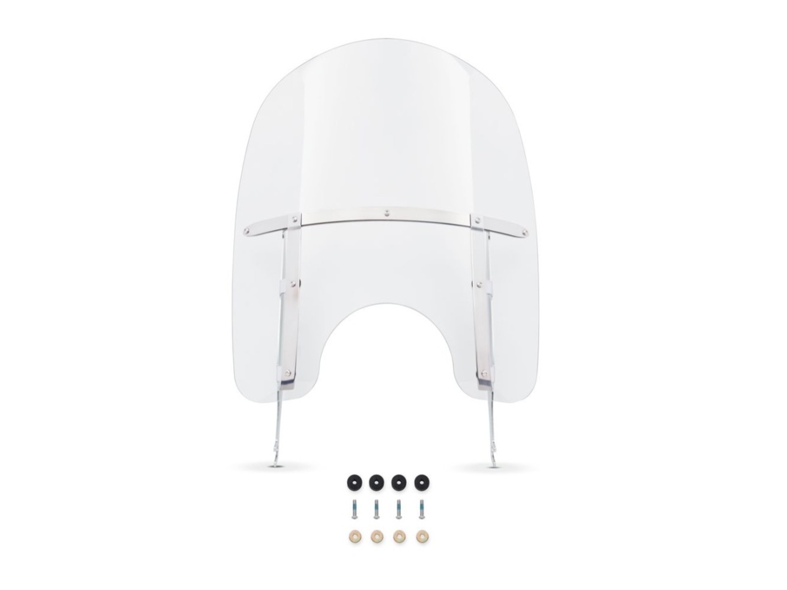 Da geht nichts dran vorbei. Die King-Size Windschutzscheibe stellt den ultimativen Schutz bereit. Diese vollständig abdeckende Windschutzscheibe sorgt für einen sauberen, abgeleiteten Luftstrom über und rund um den Fahrer und den Beifahrer. Da sie in Sekundenschnelle ohne Werkzeuge an und abgebaut werden kann, verleiht Ihnen eine abnehmbare Windschutzscheibe die Freiheit, Ihr Bike ganz schnell zu variieren. Über Land sind Sie vor den Elementen geschützt, und können die Windschutzscheibe schnell abbauen, um stilgerecht durch die Straßen zu fahren. Diese einteilige Windschutzscheibe ist aus gehärtetem Polycarbonat gefertigt und so gegen Kratzer und Schrammen geschützt. Die Scheibe wird mit Edelstahl-Montagehalterungen befestigt und zur besseren Isolierung mit Gummihülsen eingesetzt. Die Windschutzscheiben sind in einer Vielzahl von Höhen je nach Ihrer Körpergröße sowie mit traditionell polierten oder zeitgemäß schwarzglänzenden Streben passend zum Stil Ihres Bikes erhältlich. Kit inklusive Befestigungsteile.