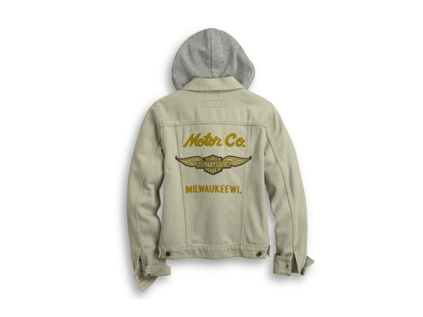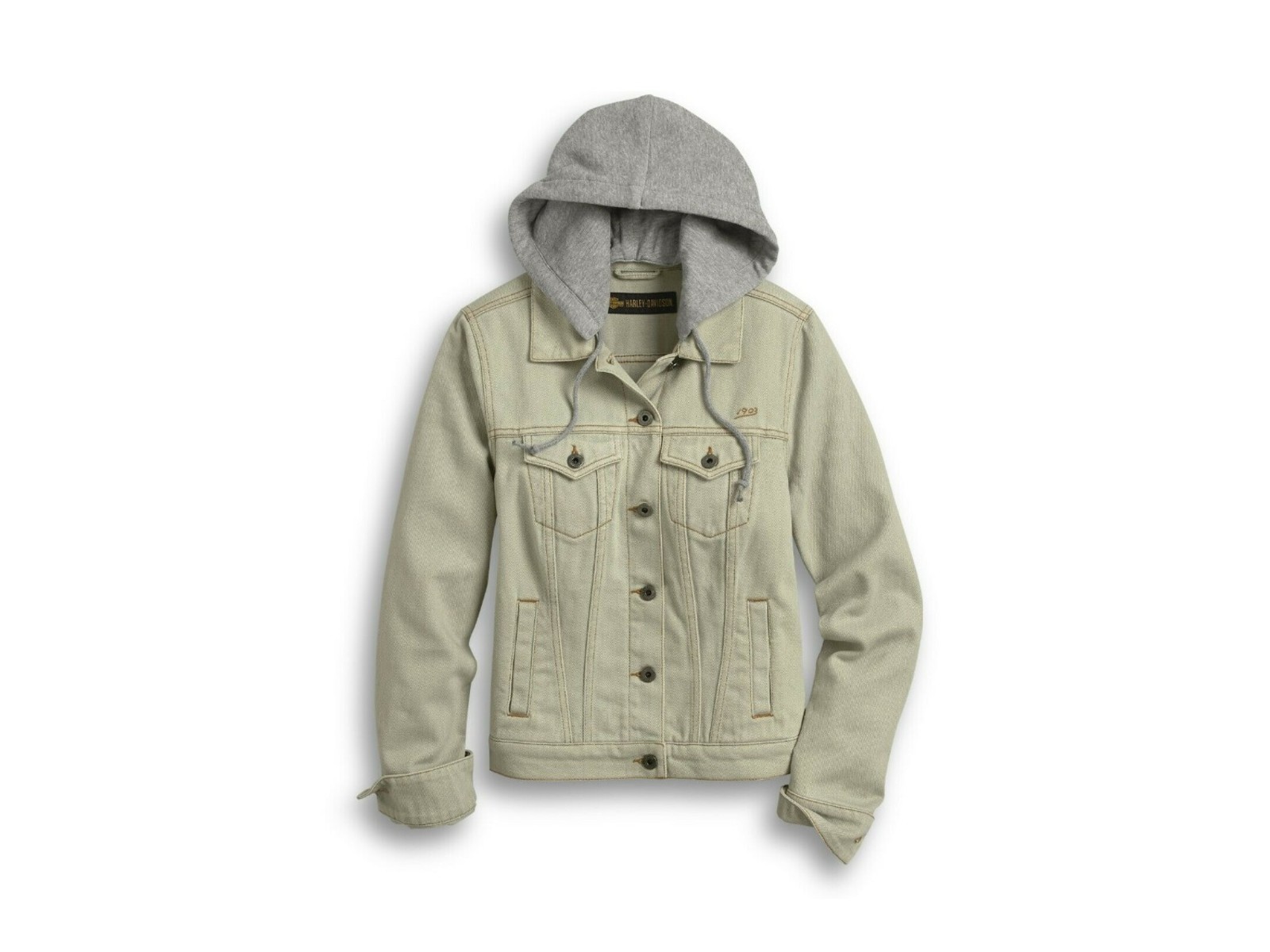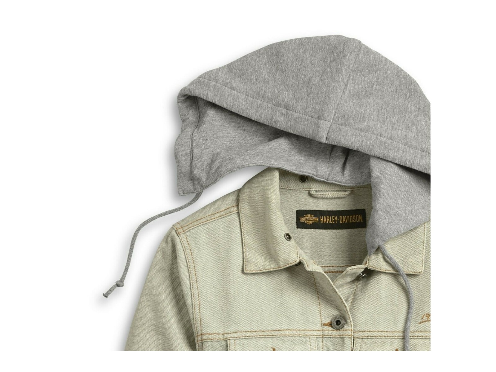 Damen Jeansjacke in grau mit abnehmbarer Kapuze. Mit gesticktem Harley-Davidson Schriftzug und Winged Motor Co Aufnäher auf dem Rücken. Die Kapuze lässt sich, durch Druckknöpfe einfach entfernen. Die Jeansjacke verfügt über zwei, mit Knöpfen zu verschließenden Brusttaschen, zwei seitlichen Taschen und zwei Innentaschen. Die Metallknöpfe sind mit dem H-D Schriftzug geprägt. 100% Baumwolle
