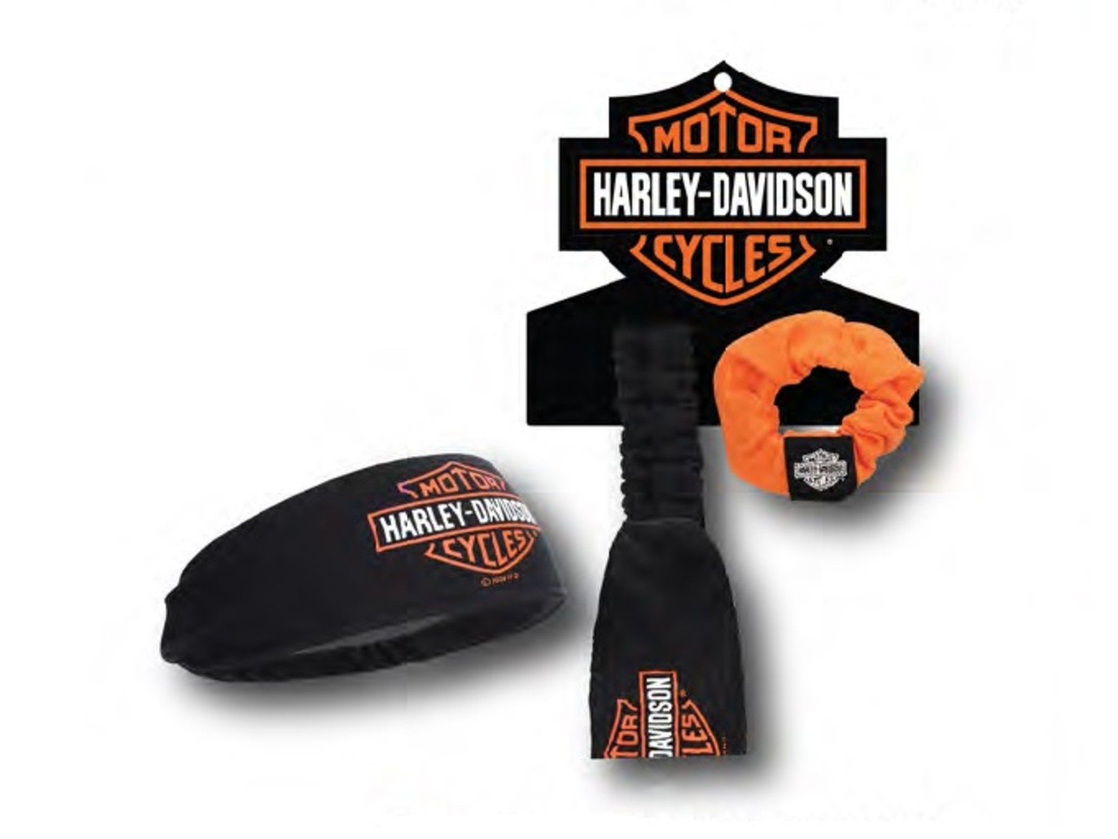 - Haarband: Schwarz mit Gummizug, gedrucktem Harley-Davidson Logo auf der Vorderseite.