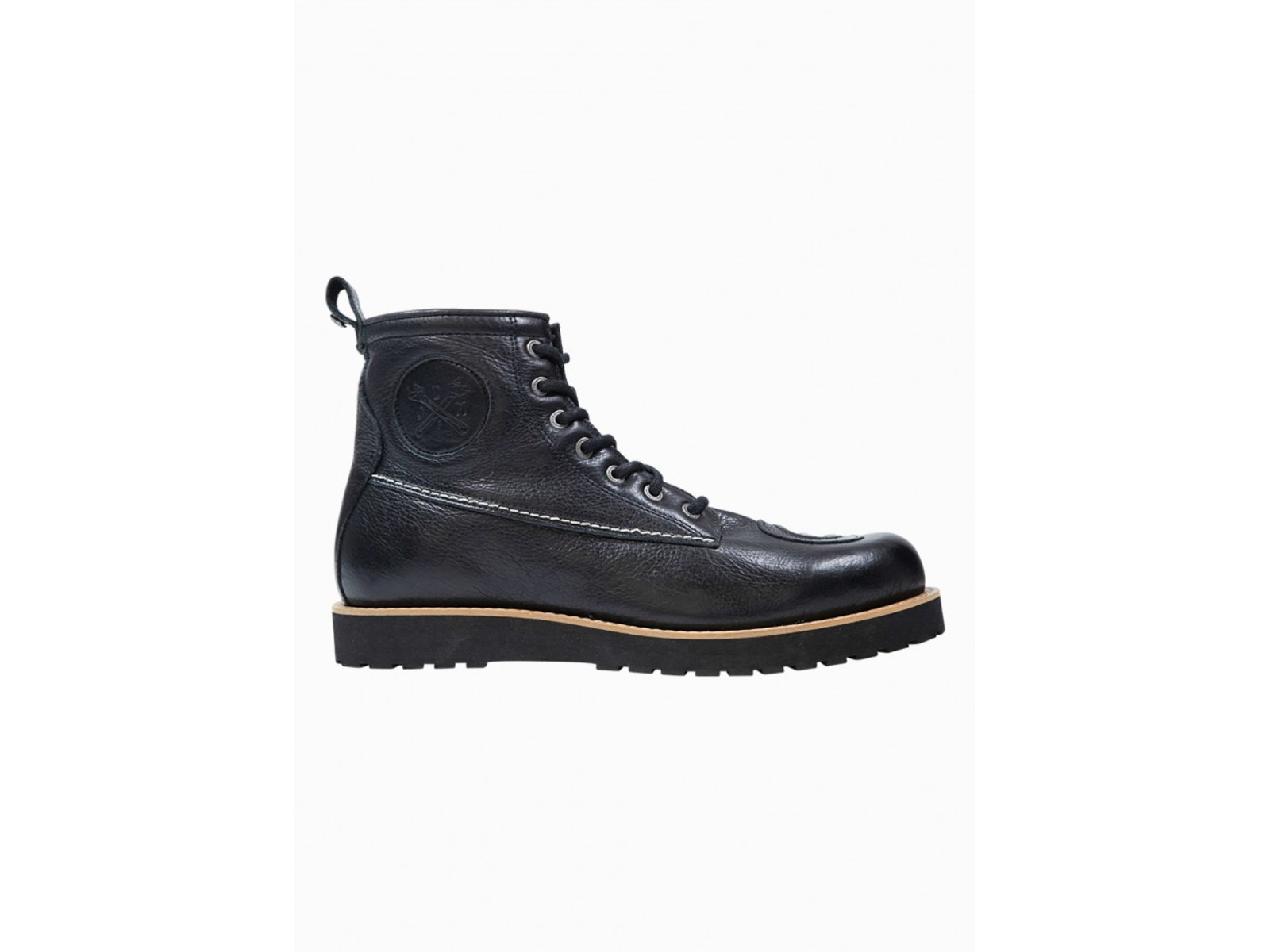 Das schöne Vintage Leder mit abgesetzten Nähten und die Details wie ein in Leder geprägtes JohnDoe Logo am Knöchelschutz oder das JDM-Metallemblem an der Einstiegslasche runden das klassische Design unseres „Iron“ ab.