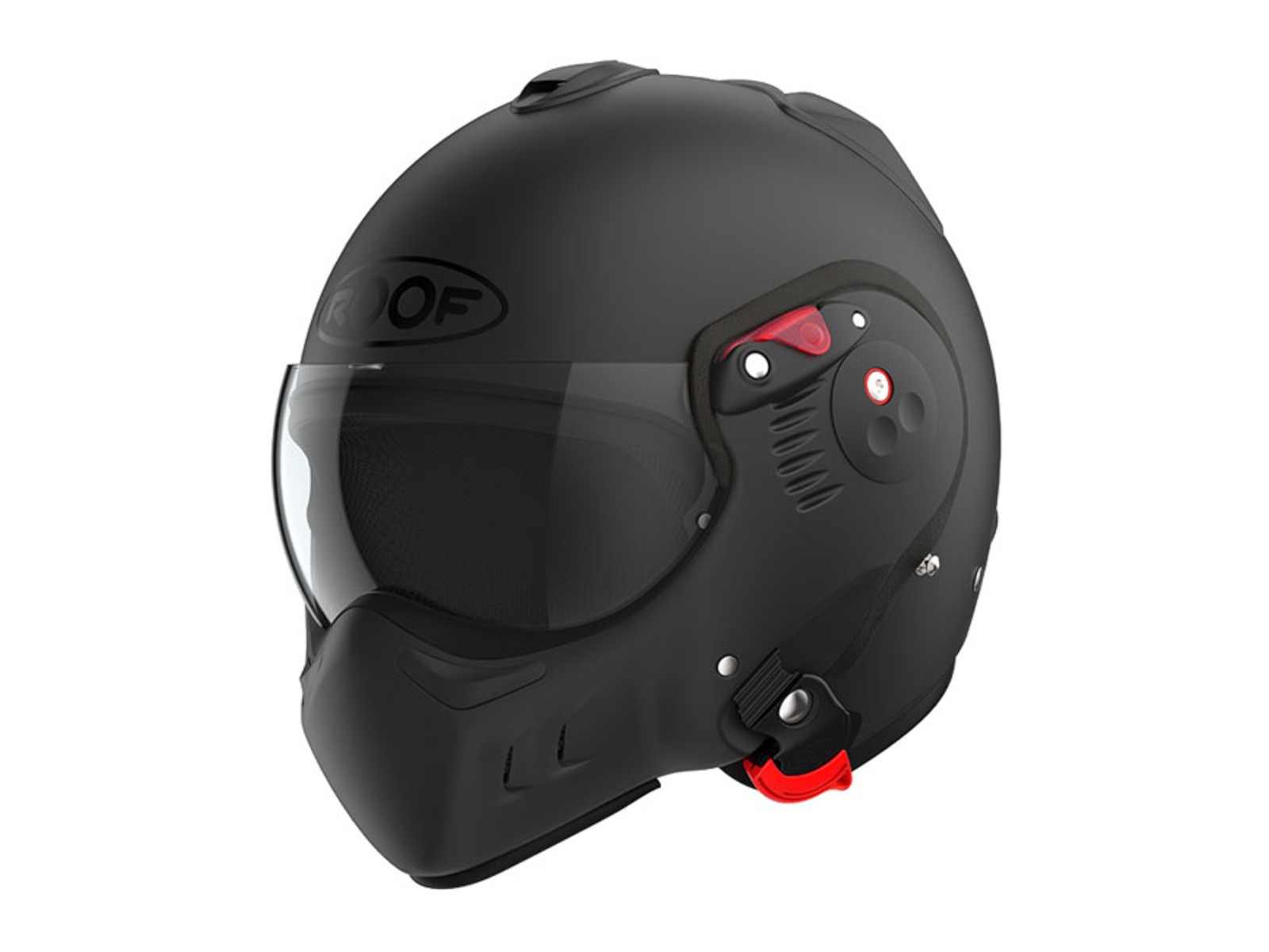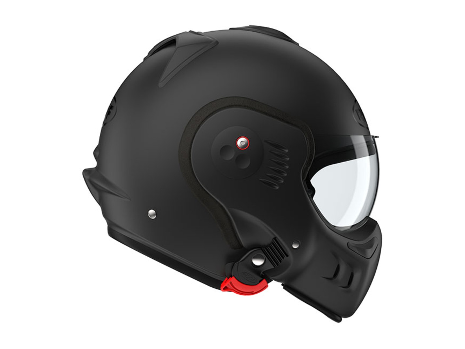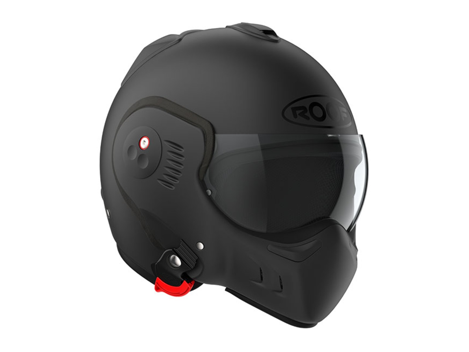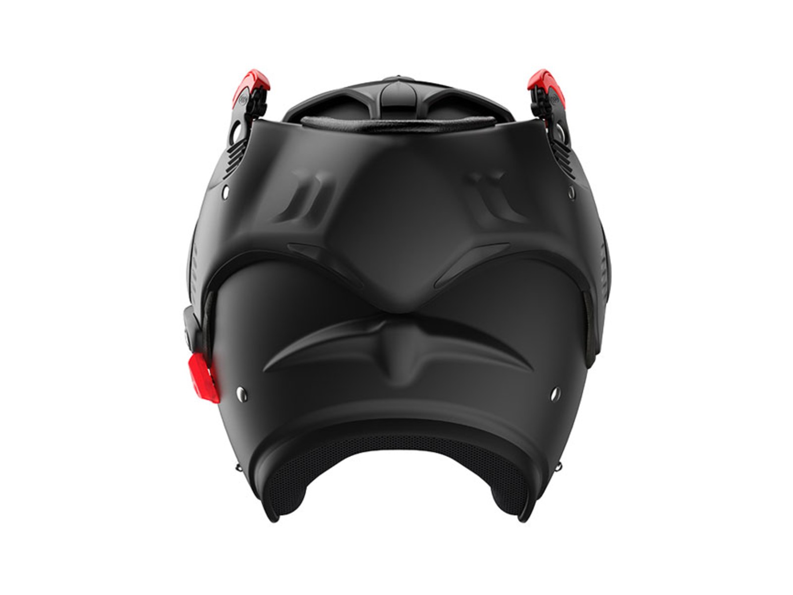 Charakteristisches 180° schwenkbares Kinnteil; zwei markante rote Sicherheitsverriegelungen.
