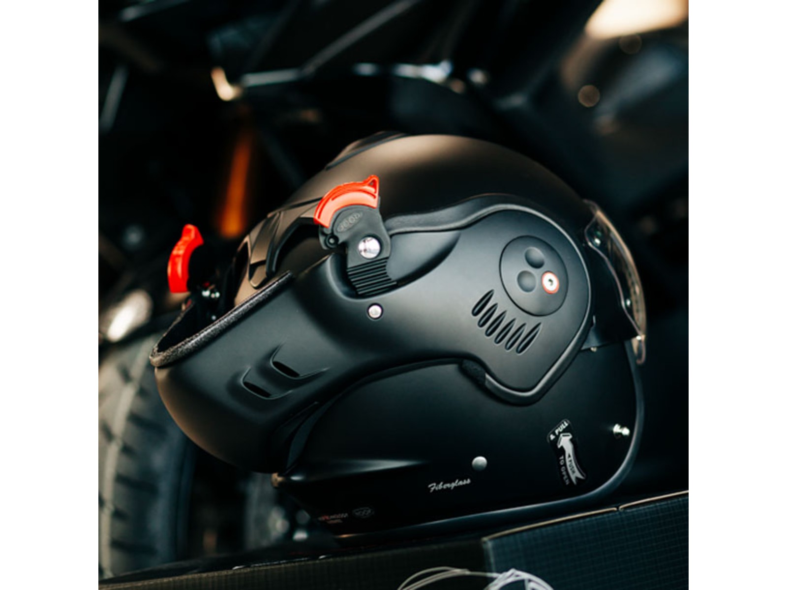 Der ROOF Boxer Alpha ist der kultige 180°-Klapphelm für alle, die urbanen Style mit moderner Sicherheit verbinden. Dank doppelter P/J-Homologation nach ECE 22.06 fährst du ihn legal als Jet- oder Integralhelm. Die Fiberglas-Außenschale sorgt für Robustheit bei moderatem Gewicht, das klare Crystal-Visier ist kratzfest und beschlaghemmend, und die mikrometrische Ratsche macht das Schließen schnell und komfortabel. Intercom-Vorbereitung und angepasstes Innenleben runden den Alltagskomfort ab.