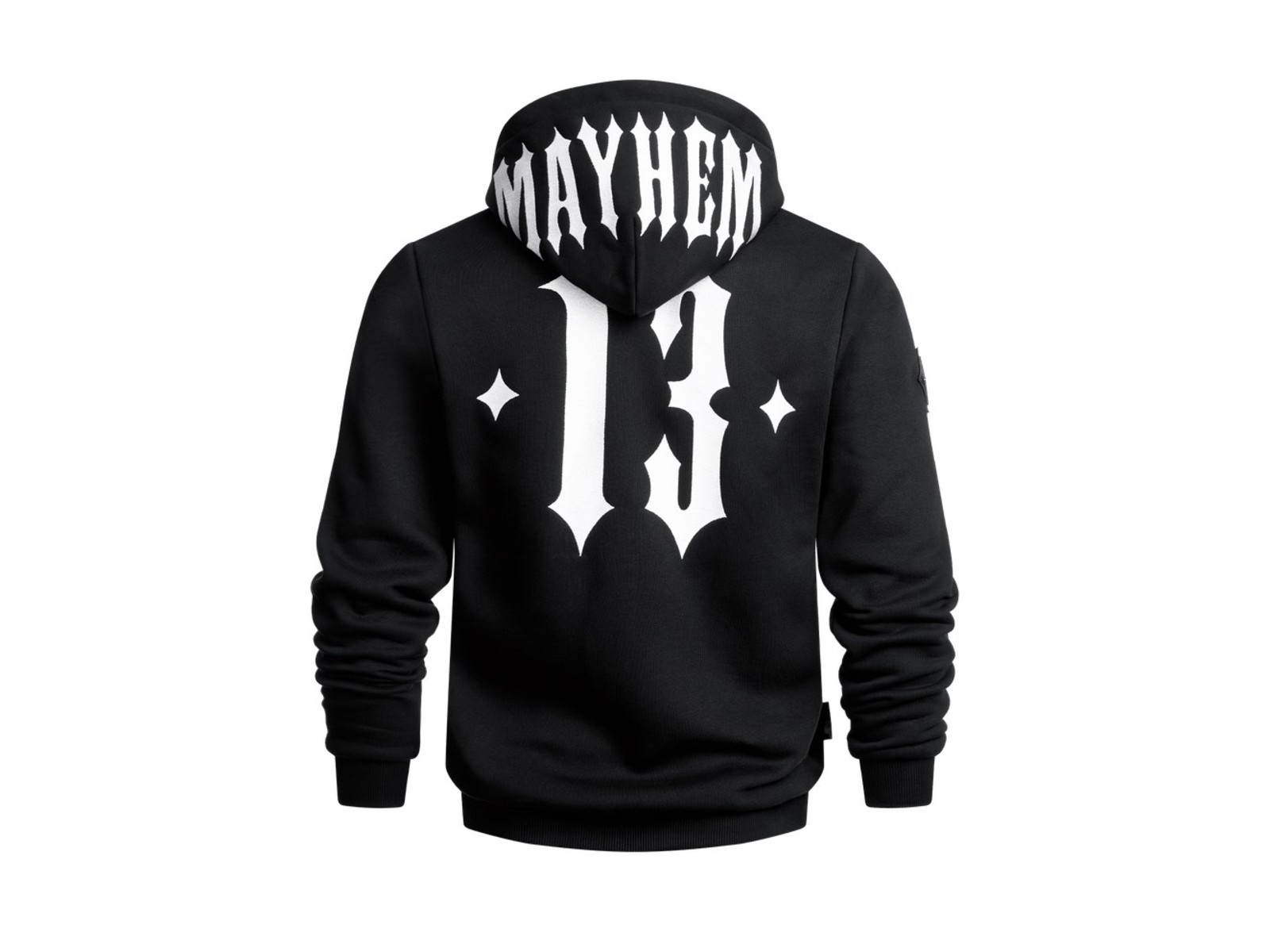 Auf der Brust befindet sich unser Classic Logo in Form eines hochwertigen Sticks, auf der Rückseite ist eine große 13 gestickt. Die Kapuze ist zusätzlich mit einem großen Mayhem Schriftzug versehen, ebenfalls als Stick.