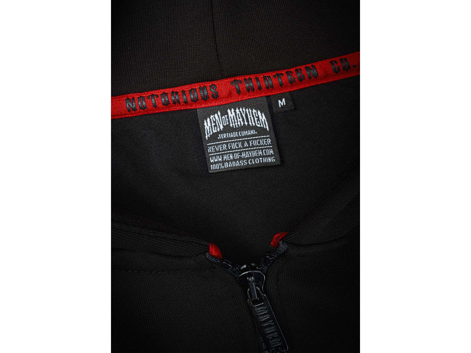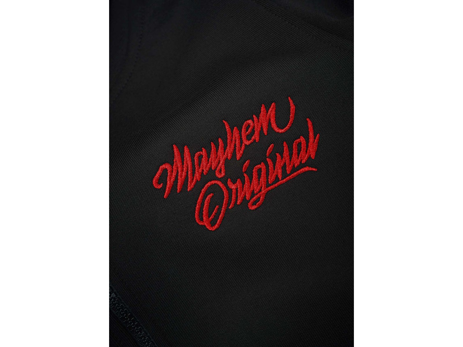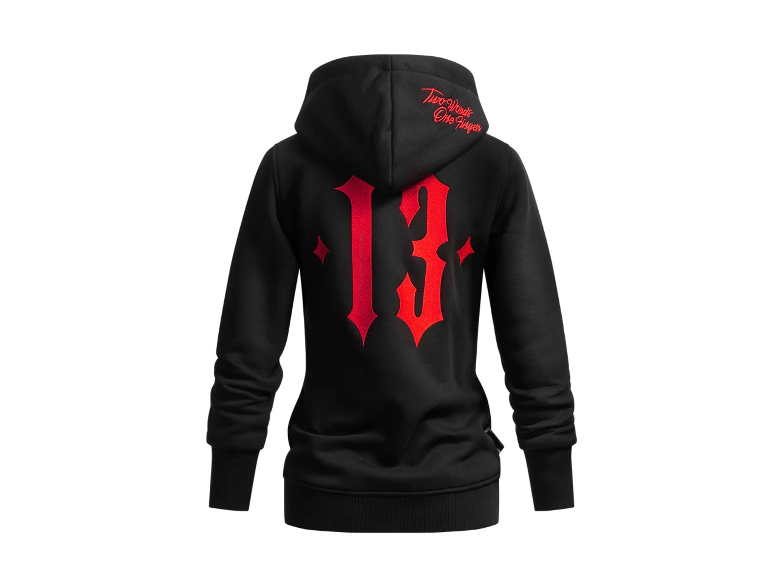 Die Two Words One Finger Hoodie Jacke überzeugt durch den angenehm weichen und dicken Stoff, in Kombination mit hochwertigen Stickarbeiten. Die halblange Jacke ist tailliert geschnitten und mit einigen Details versehen. Auf der Brust ist der „Mayhem Originals“ Schriftzug gestickt, auf der Rückseite ist eine große gestickte 13. Die Kapuze ist zusätzlich mit einem „Two Words One Finger“ Stick versehen.