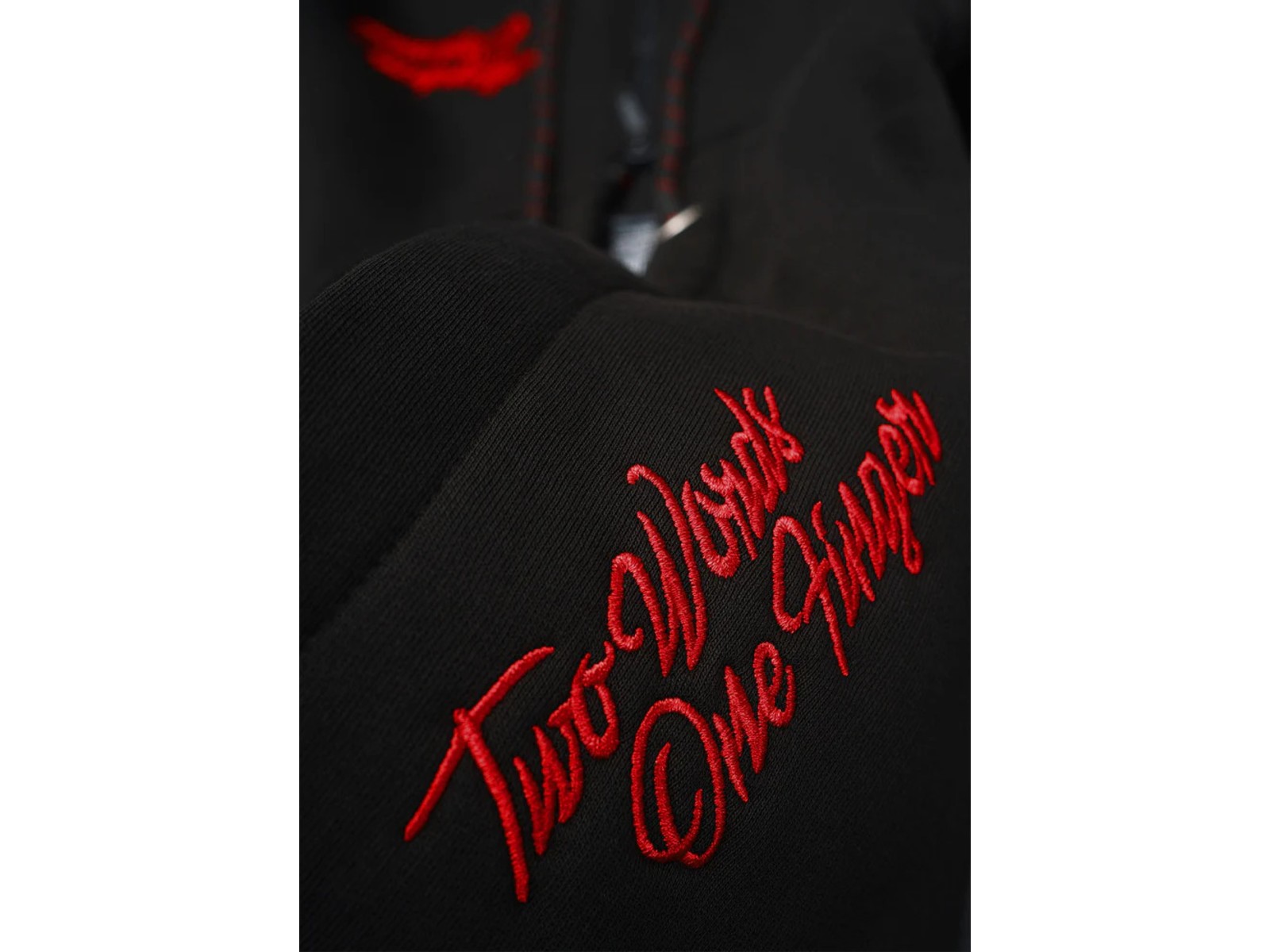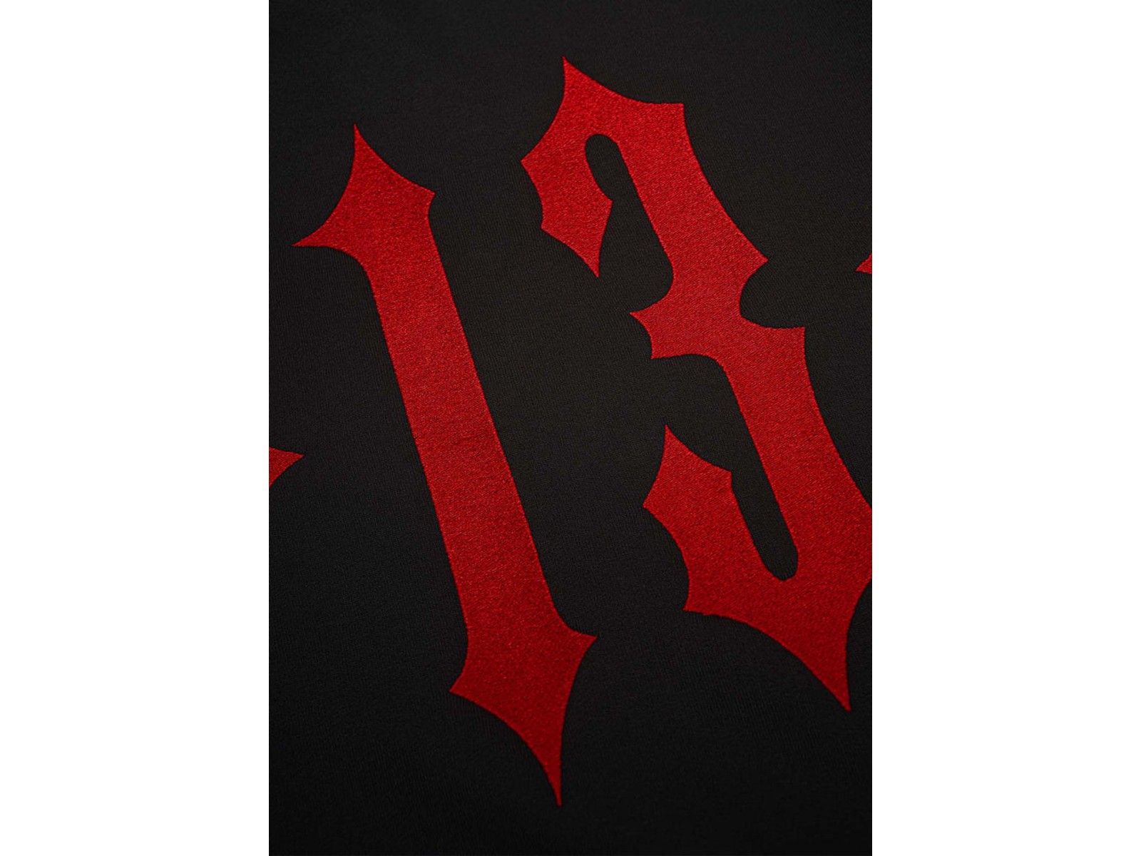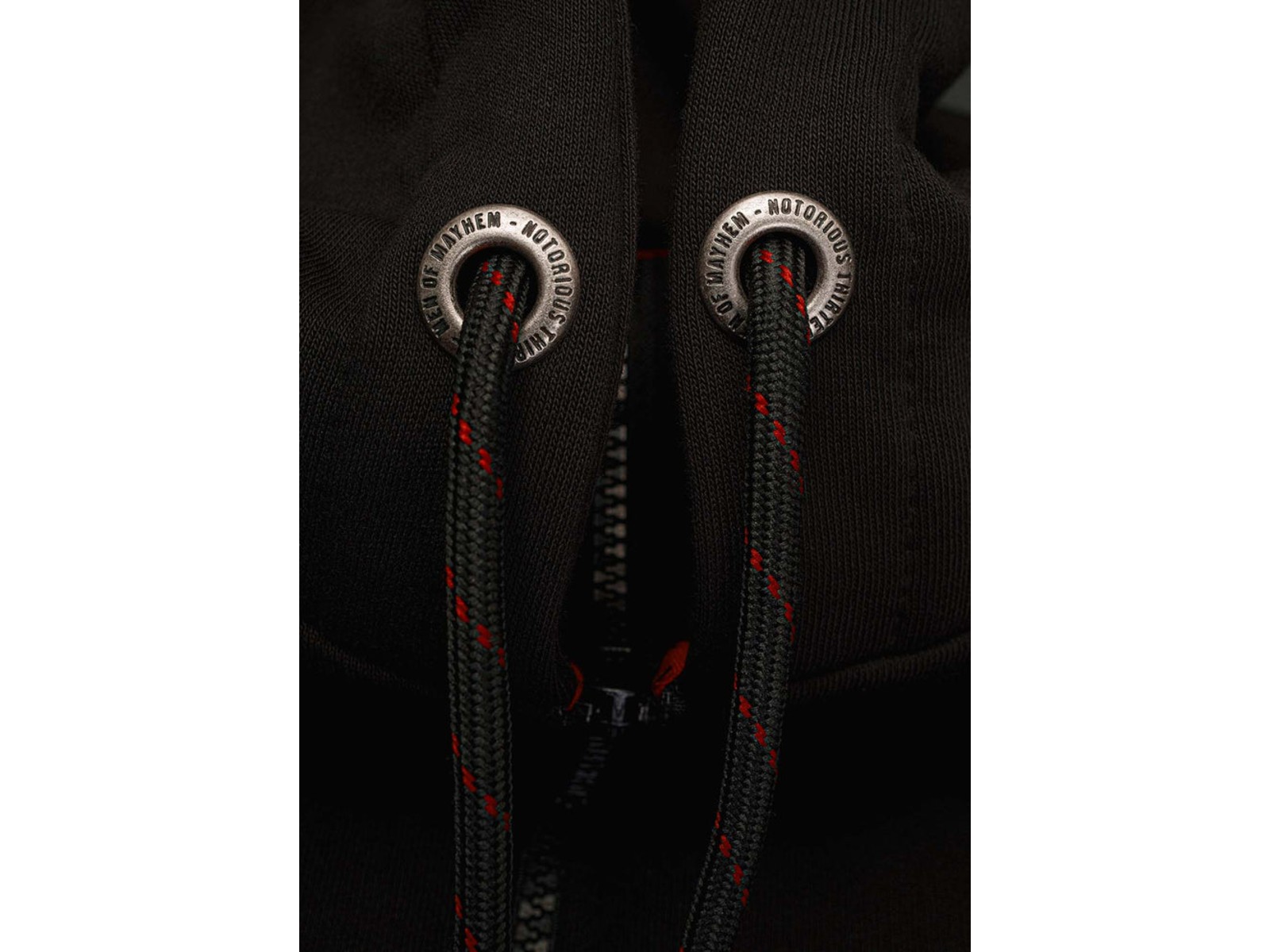 Die Two Words One Finger Hoodie Jacke überzeugt durch den angenehm weichen und dicken Stoff, in Kombination mit hochwertigen Stickarbeiten. Die halblange Jacke ist tailliert geschnitten und mit einigen Details versehen. Auf der Brust ist der „Mayhem Originals“ Schriftzug gestickt, auf der Rückseite ist eine große gestickte 13. Die Kapuze ist zusätzlich mit einem „Two Words One Finger“ Stick versehen.