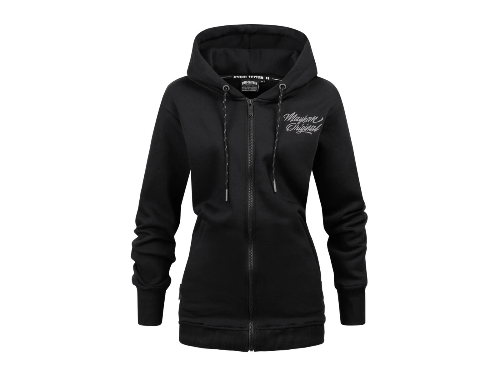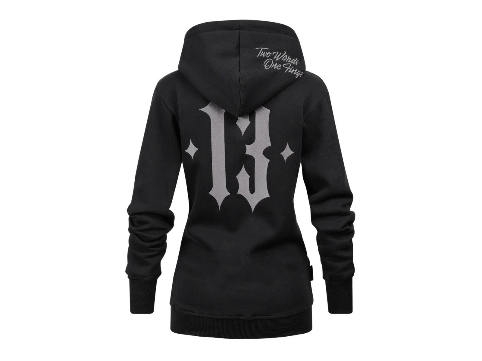 Auf der Brust ist der „Mayhem Originals“ Schriftzug gestickt, auf der Rückseite ist eine große gestickte 13. Die Kapuze ist zusätzlich mit einem „Two Words One Finger“ Stick versehen.