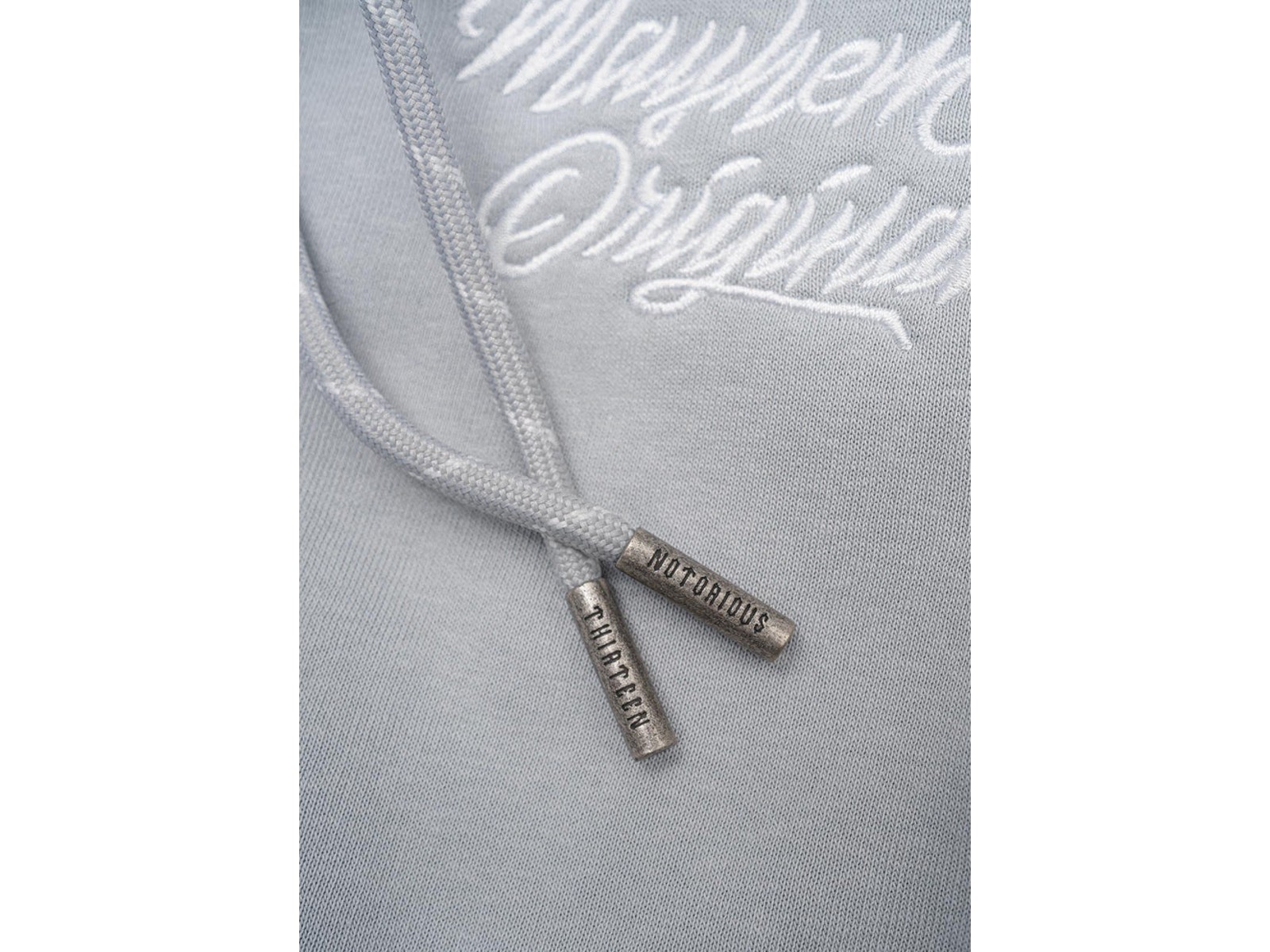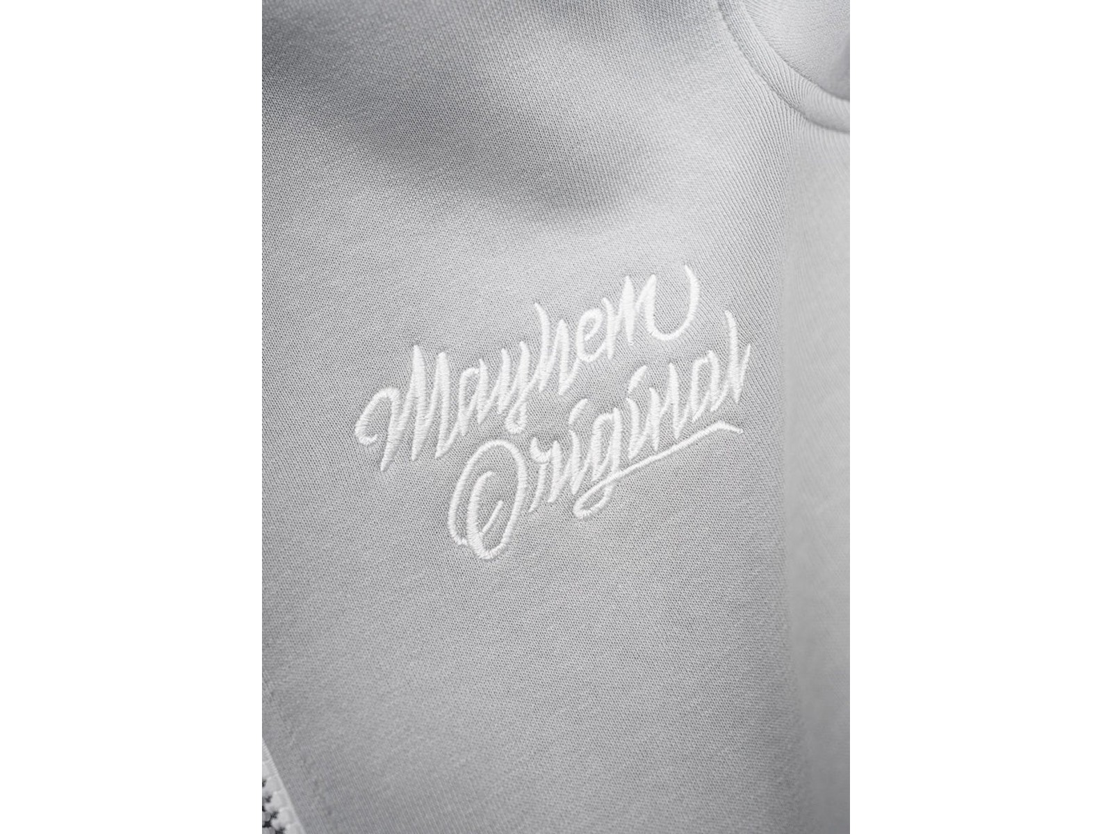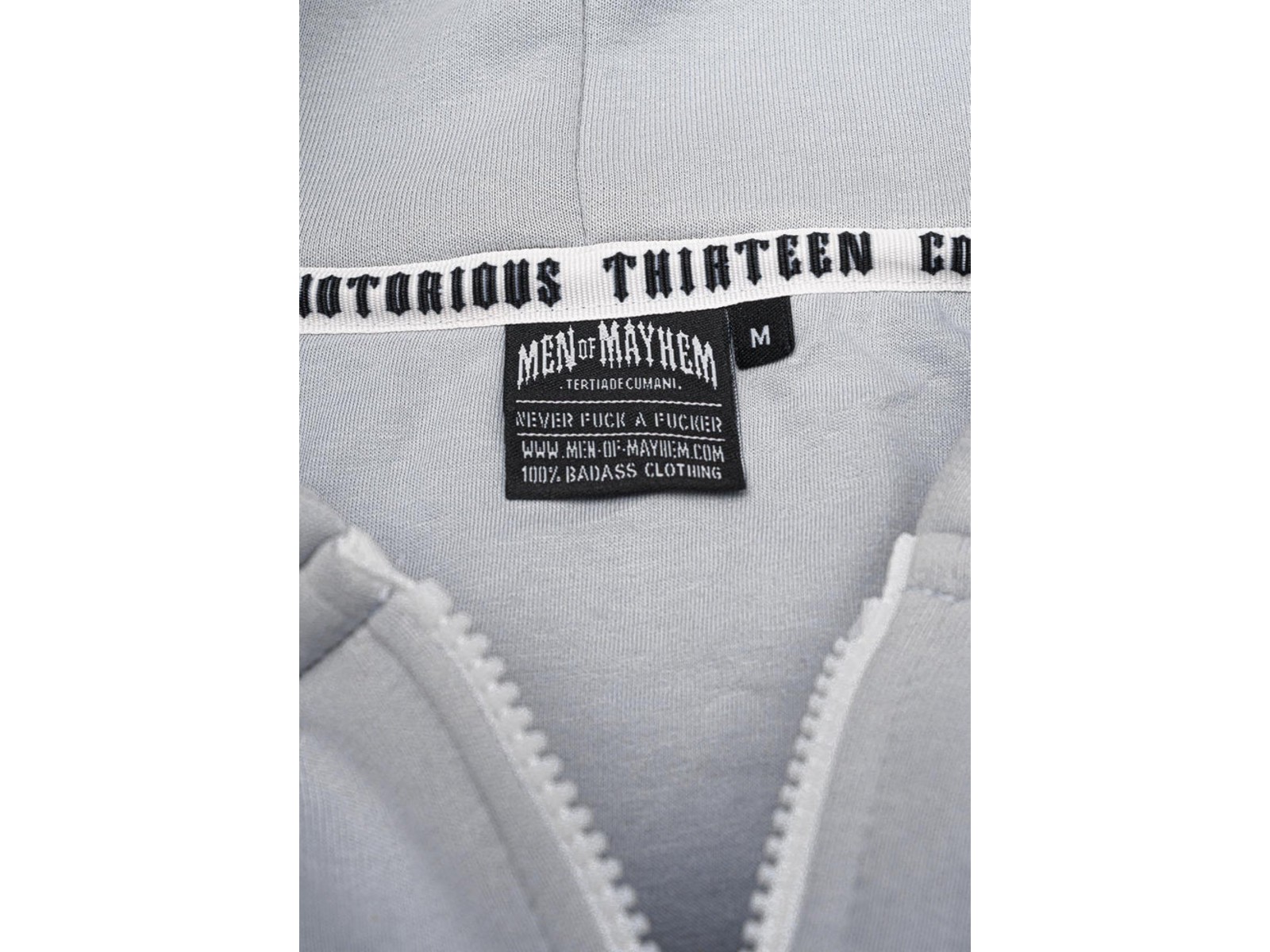 Die Two Words One Finger Hoodie Jacke überzeugt durch den angenehm weichen und dicken Stoff, in Kombination mit hochwertigen Stickarbeiten. Die halblange Jacke ist tailliert geschnitten und mit einigen Details versehen. Auf der Brust ist der „Mayhem Originals“ Schriftzug gestickt, auf der Rückseite ist eine große gestickte 13. Die Kapuze ist zusätzlich mit einem „Two Words One Finger“ Stick versehen.
