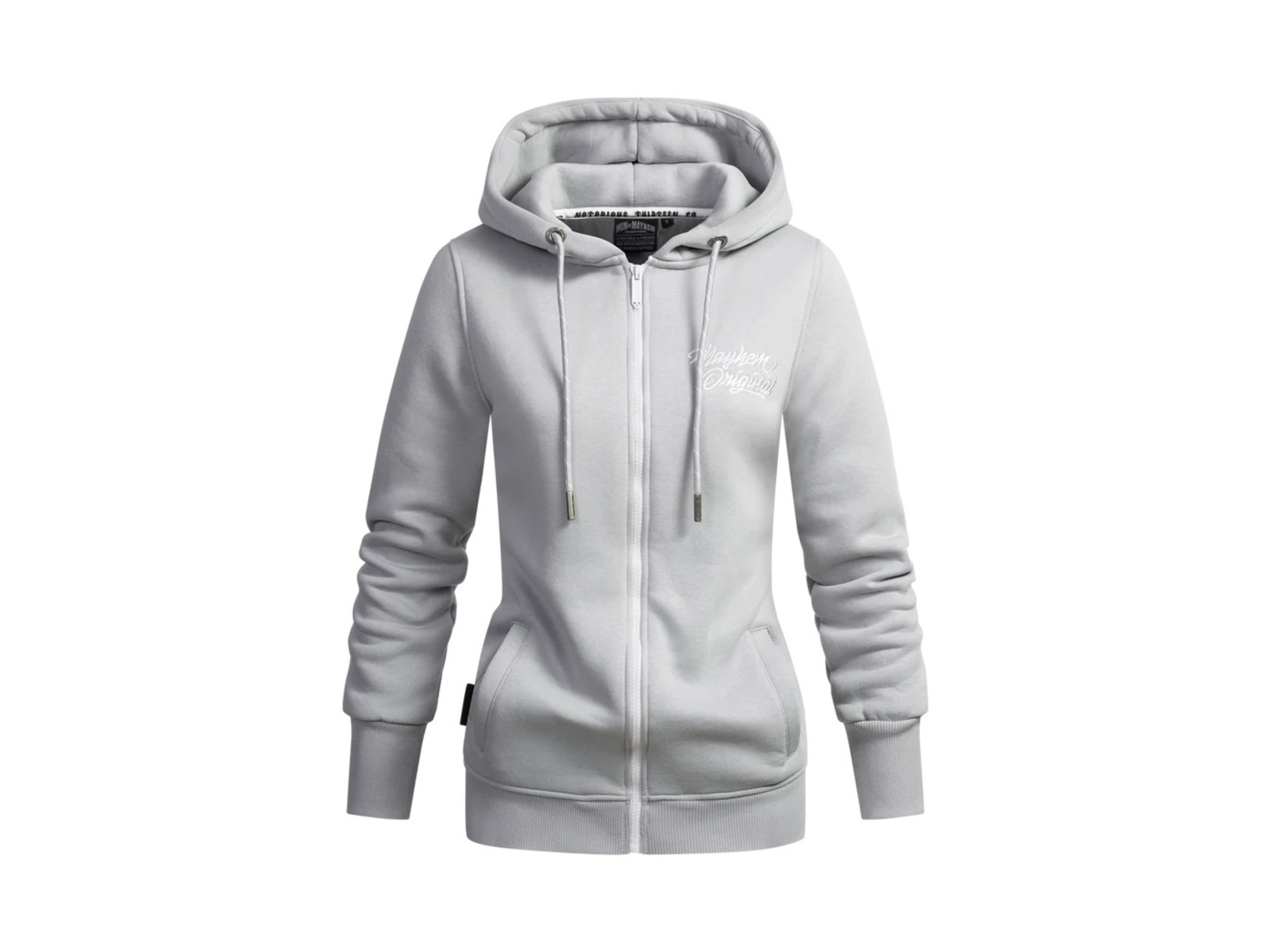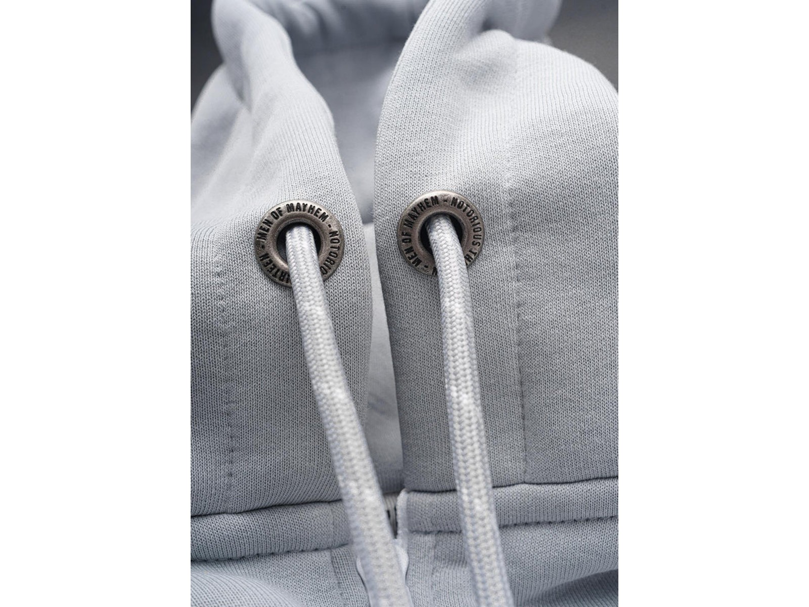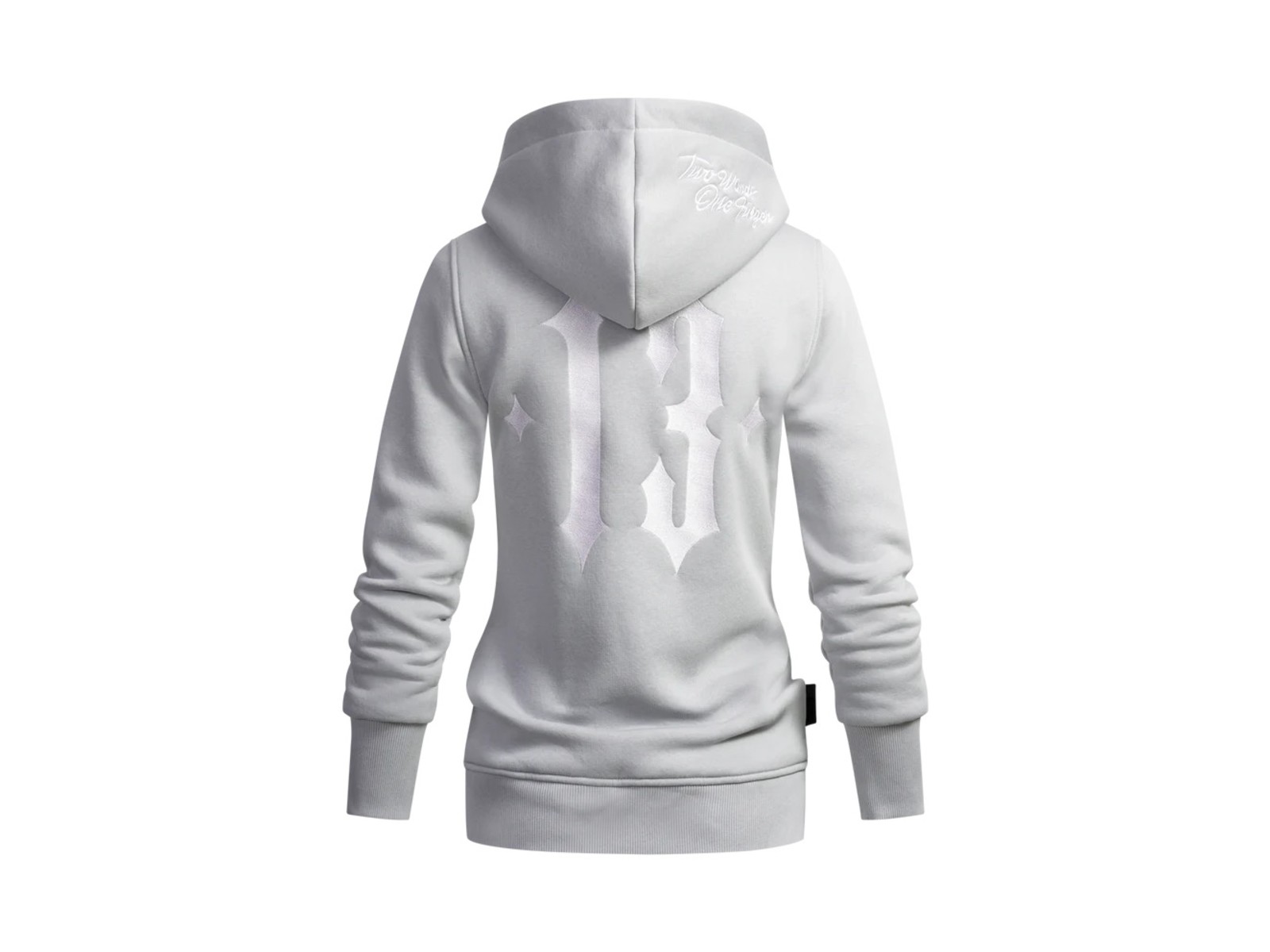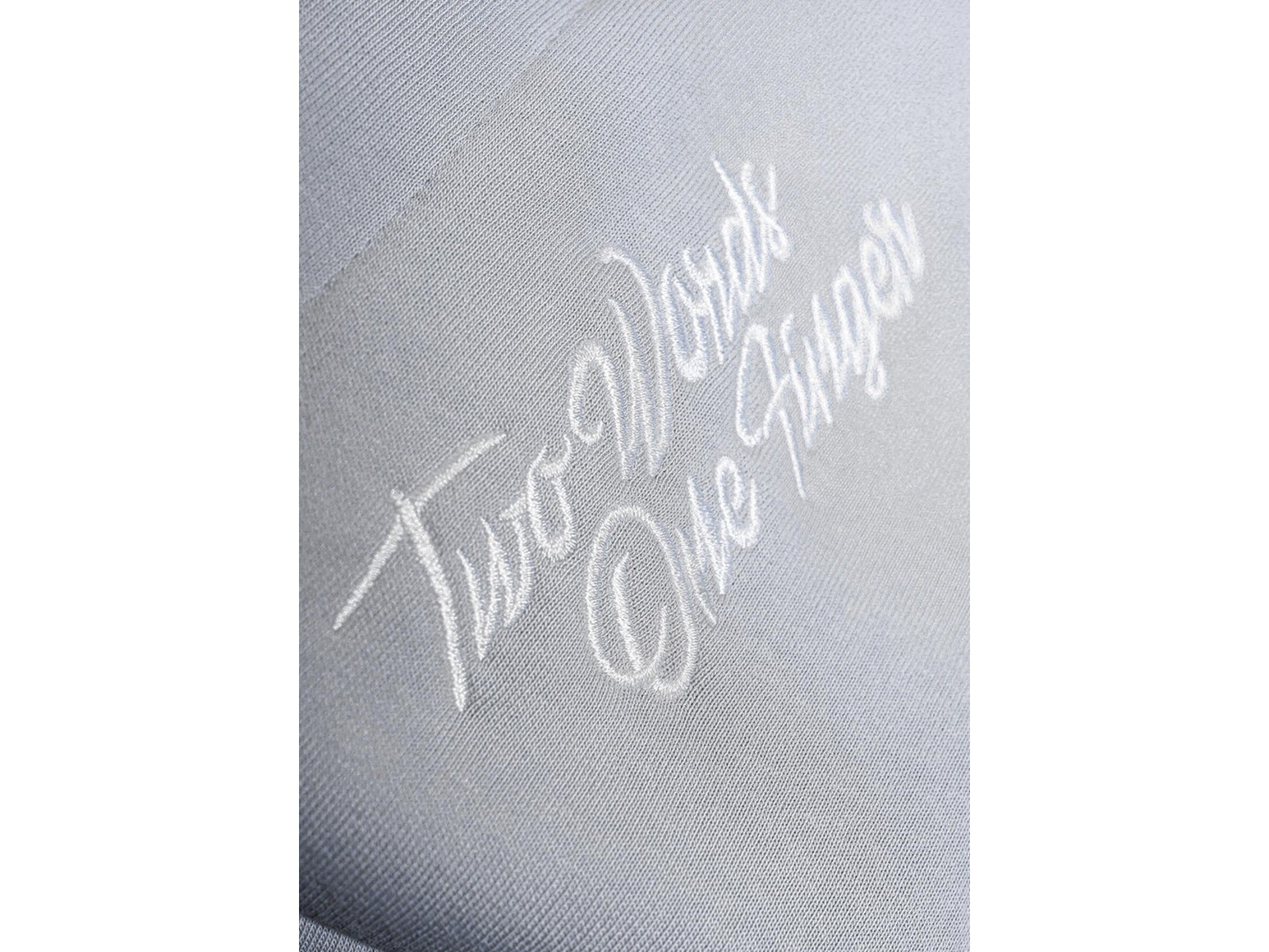 Die Two Words One Finger Hoodie Jacke überzeugt durch den angenehm weichen und dicken Stoff, in Kombination mit hochwertigen Stickarbeiten. Die halblange Jacke ist tailliert geschnitten und mit einigen Details versehen. Auf der Brust ist der „Mayhem Originals“ Schriftzug gestickt, auf der Rückseite ist eine große gestickte 13. Die Kapuze ist zusätzlich mit einem „Two Words One Finger“ Stick versehen.