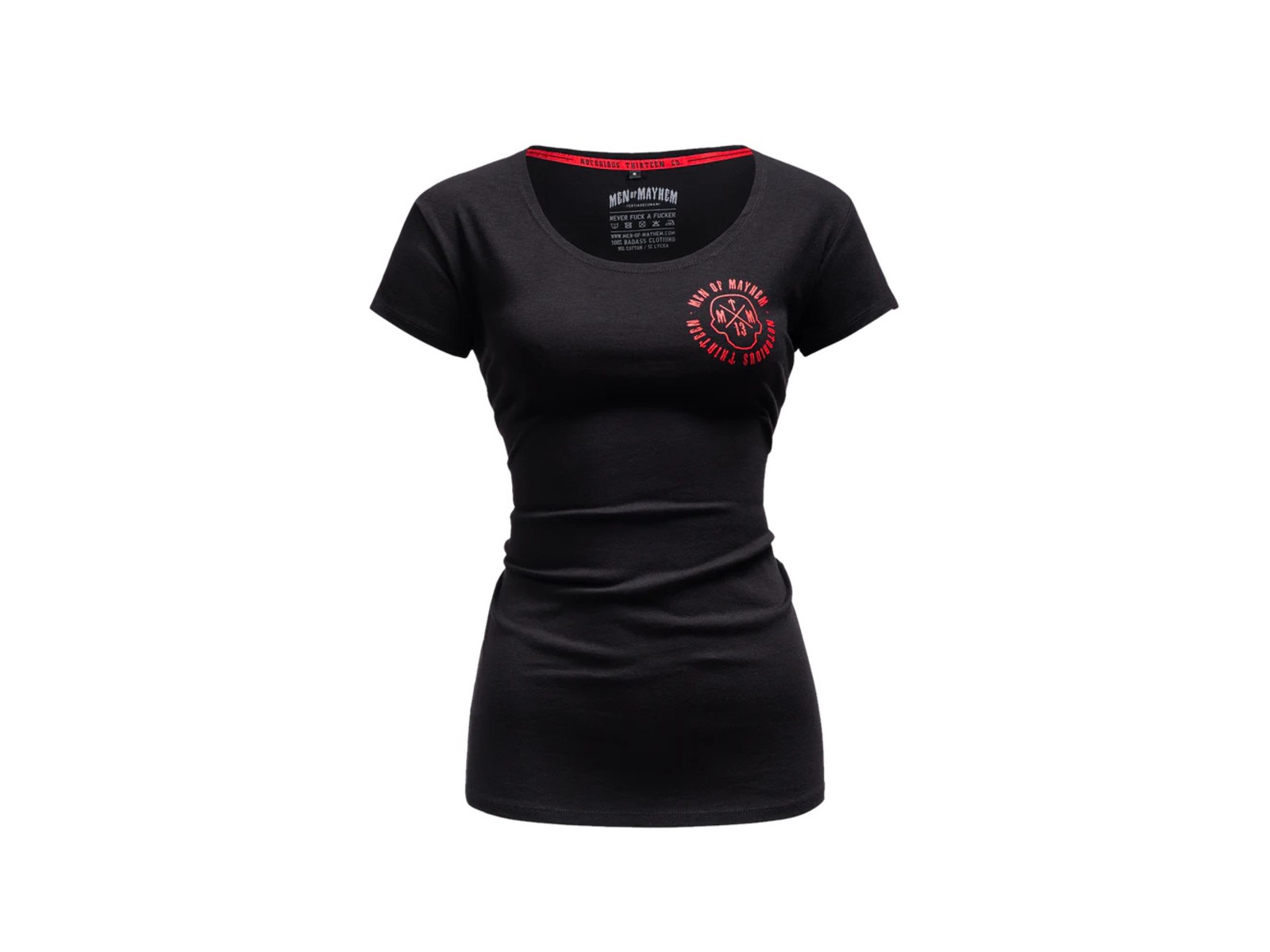 Auf der Brust des T-Shirts ist ein Print mit der Aufschrift „MEN OF MAYHEM – NOTORIOUS THIRTEEN“, in Kombination mit dem Mayhem Skull Cross.