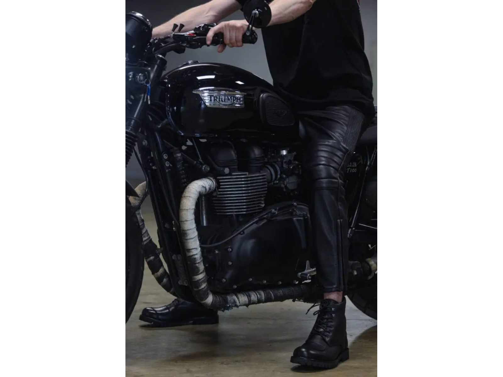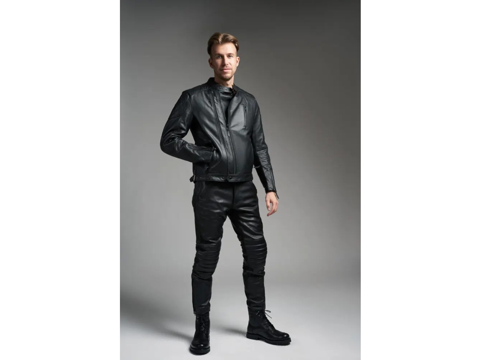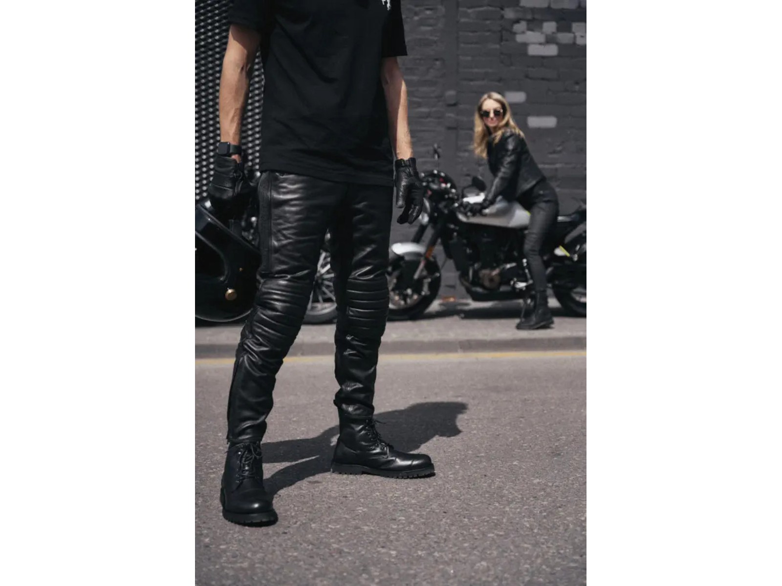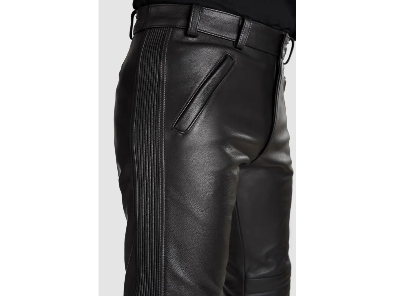 - Herren-Lederhosen, inspiriert von Vergangenheit und Zukunft. Hergestellt aus schwarzem Rindsleder mit einer Dicke von 1,2 mm.