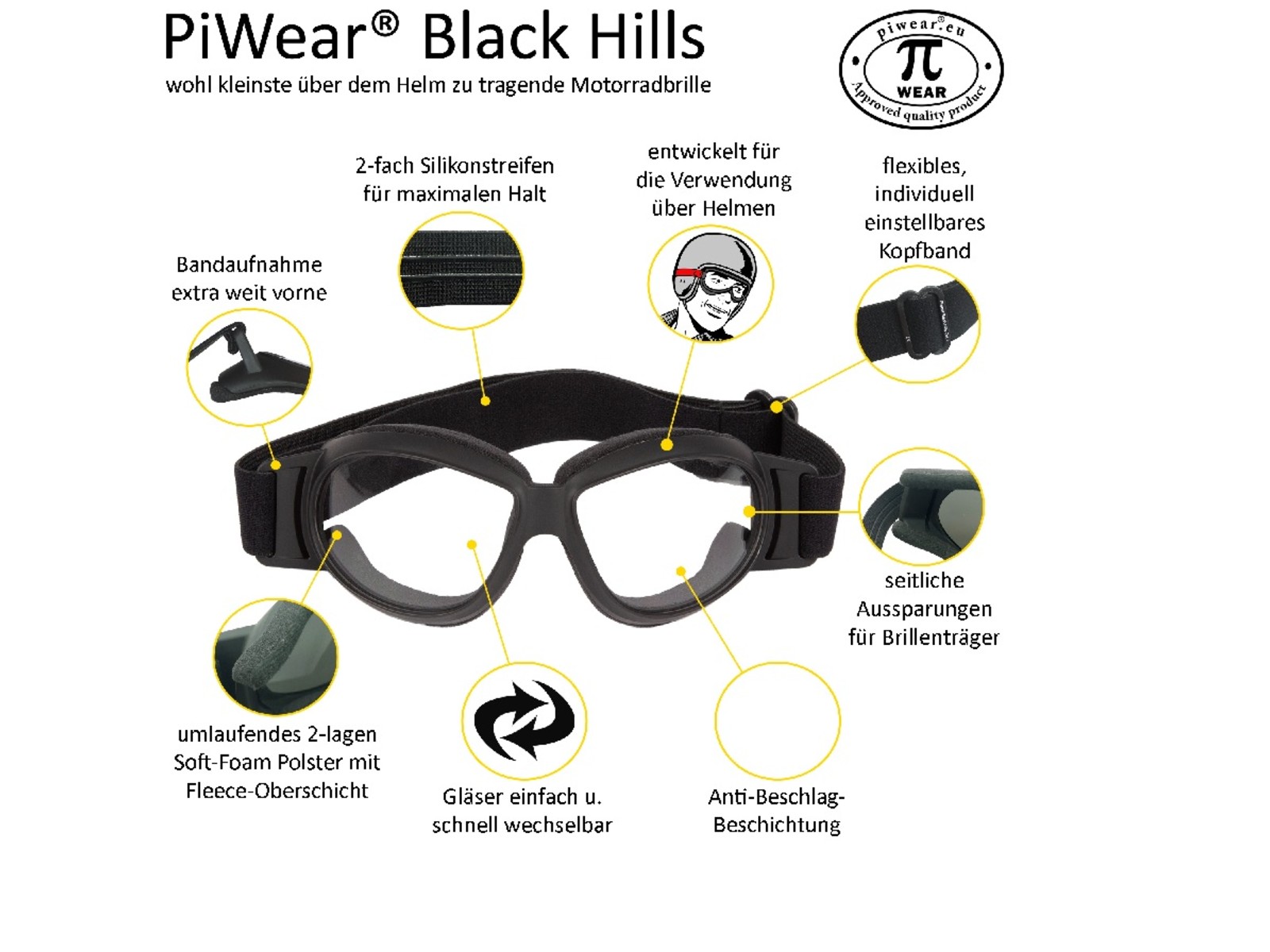 - Endlich ist sie da – die wahrscheinlich kleinste Bandbrille die ÜBER dem Helm getragen werden kann. Durch die von uns speziell entwickelte Brillenbandaufnahme, ist es problemlos möglich die Brille über nahezu jedem Helm zu tragen. Die Zeiten, dass erst die Brille aufgesetzt werden muss und danach der Jethelm sind hiermit nun vorbei. Endlich eine kleine stylische Brille, die trotzdem über dem Helm getragen werden kann Durch die seitlichen Aussparungen im Polster kann sie auch problemlos über so manche optische Brille getragen werden. Durch die hohe Flexibilität im Bereich des Nasenmittelstegs passt sich die Black Hills jeder Gesichtsform perfekt an. Ein hoher Tragekomfort wird durch das 2 lagige Polster erzielt. Die erste Lage ist ein stabiles komfortables Softfoam und darauf ist ein angenehmes weiches Fleece angebracht. Damit die Brille auch bei höheren Geschwindigkeiten nicht vom Helm rutscht bzw. ihre Position verändert, ist das leicht zu verstellende Band mit drei Silikonstreifen in Wellenform versehen.