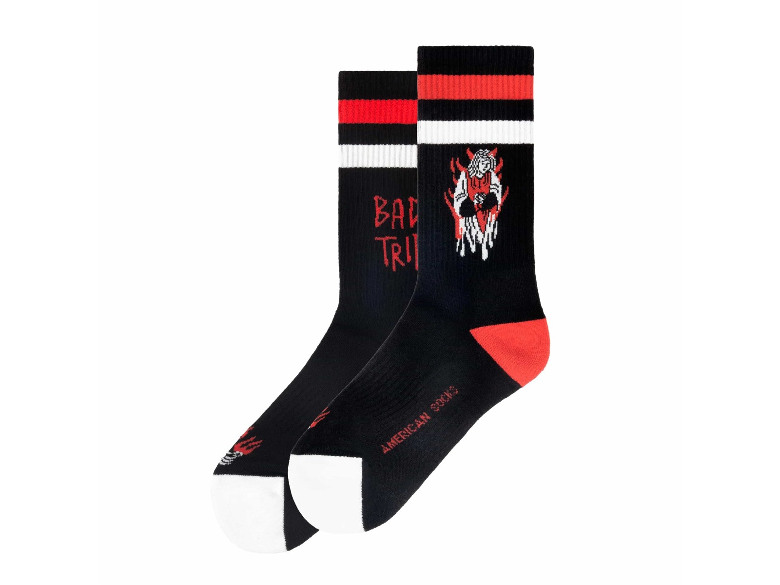 Die Bad Trip Socken von American Socks sind nicht nur ein Fashion-Statement, sondern auch ein absolutes Must-Have für Skater, Biker und Streetwear-Fans. Das auffällige Design mit roten und weißen Details, kombiniert mit dem düsteren "Bad Trip"-Schriftzug und einer teuflischen Grafik, sorgt für einen einzigartigen Look, der garantiert Blicke auf sich zieht.