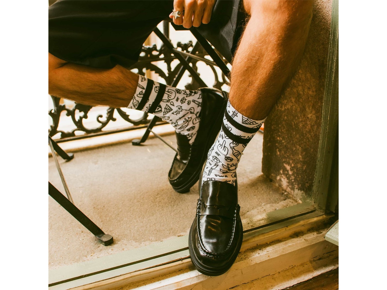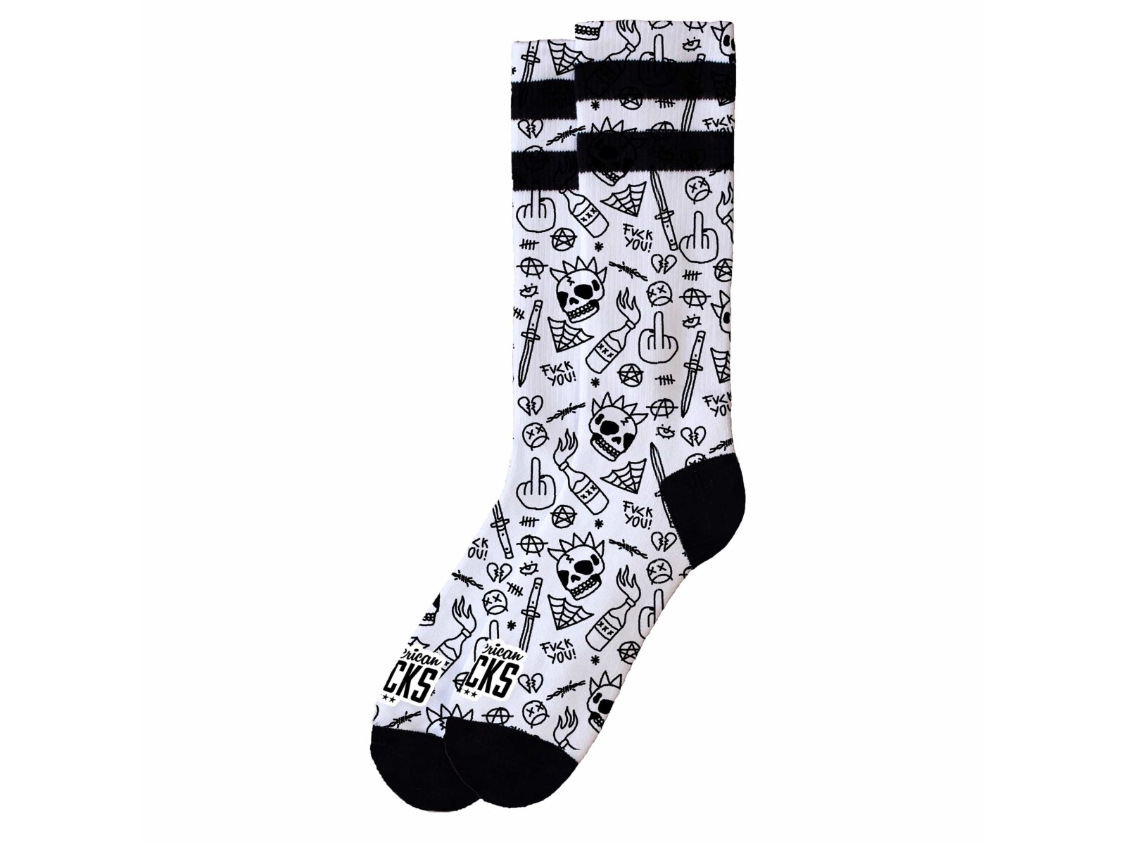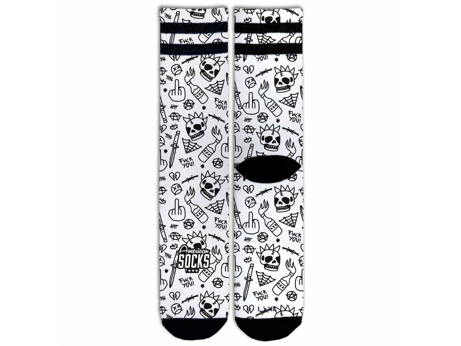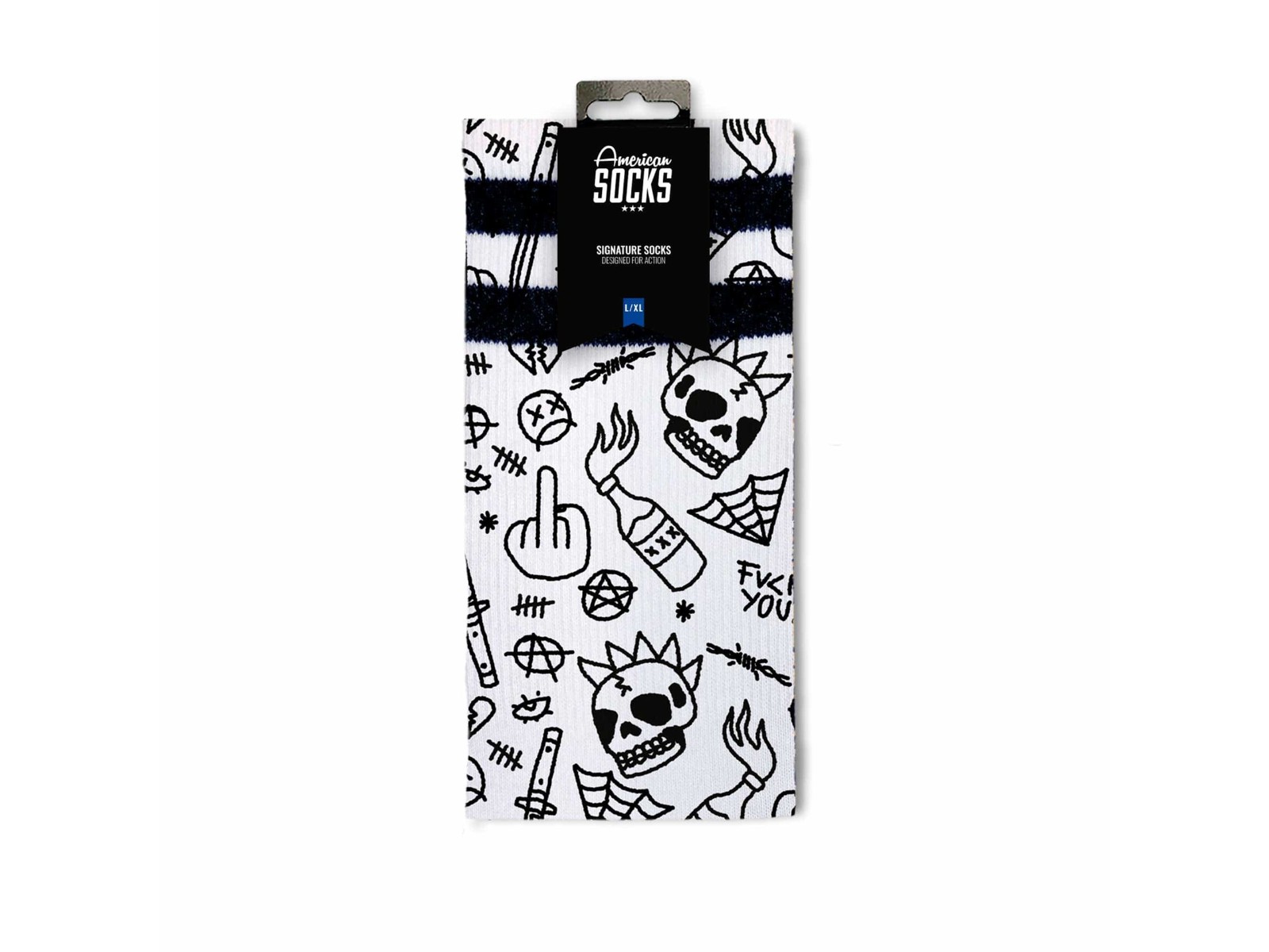Die No Direction Socken von American Socks sind ein echtes Statement für alle, die sich von niemandem sagen lassen, wo es langgeht! Das schwarz-weiße Allover-Design mit rebellischen Symbolen, Totenköpfen und Anarchie-Elementen macht diese Socken zu einem Must-Have für echte Punks, Skater und Streetwear-Liebhaber. Perfekt für alle, die ihren eigenen Weg gehen!
