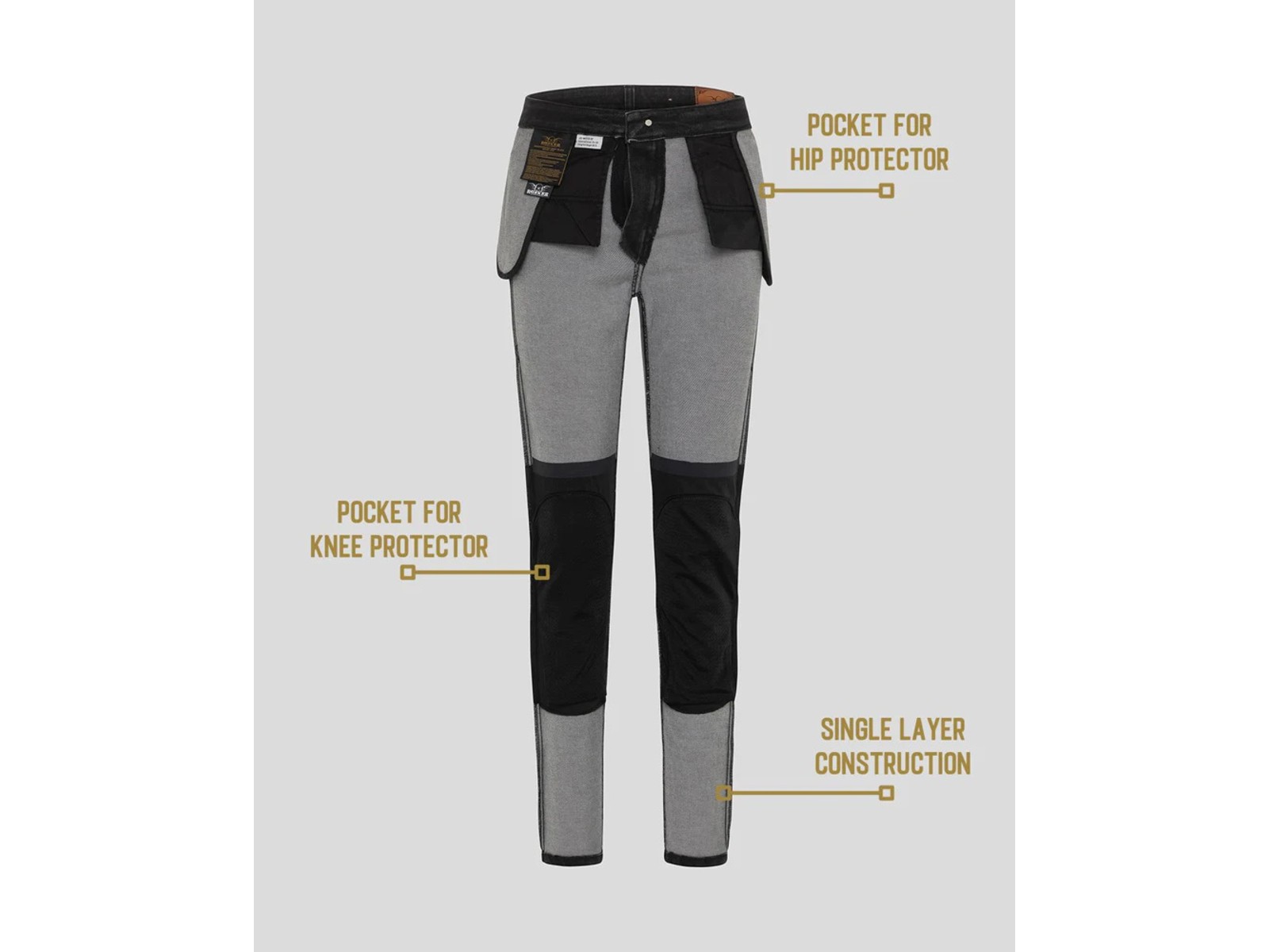 - Eingearbeitete Protektorentaschen an Hüften