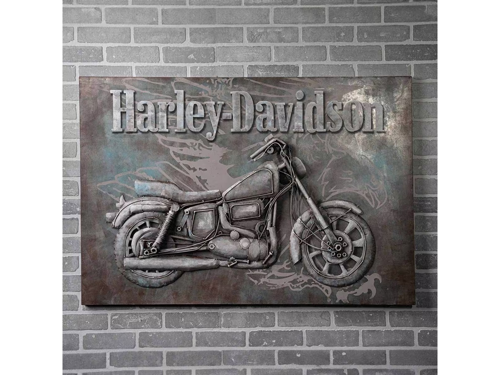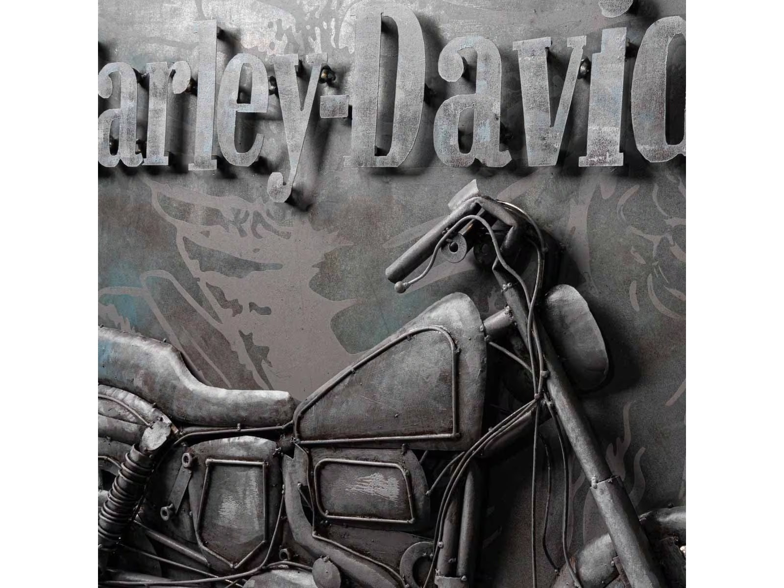 - Design: Handgeschnittenes und geformtes Motorraddesign aus Stahl mit verwitterter Oberfläche, erhabenes Harley-Davidson-Logo und ein Adler im Sturzflug im Hintergrund